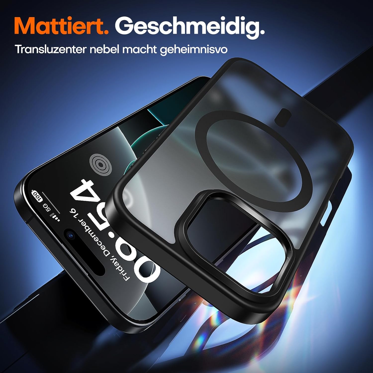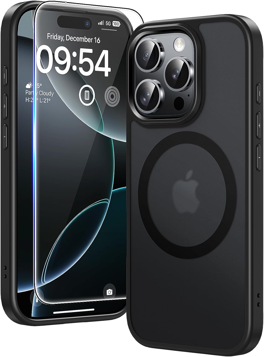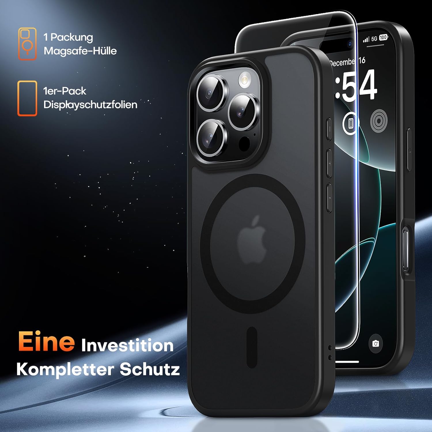 TAURI Кейс за iPhone 16 Pro 6.3 инча със закалено стъклено фолио, съвместим с MagSafe, военна стандартна защита, [против пожълтяване] удароустойчив магнитен кейс за мобилен телефон - матово черно