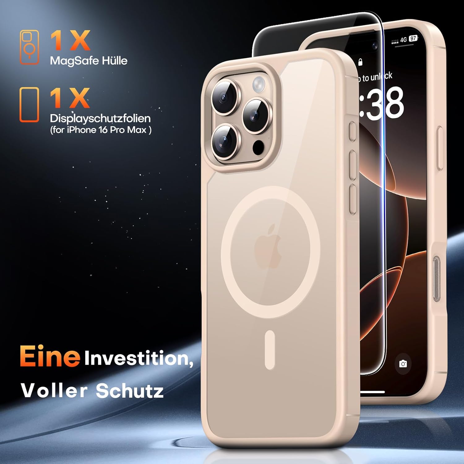 TAURI Кейс за iPhone 16 Pro 6.3 инча със закалено стъклено фолио, съвместим с MagSafe, военна стандартна защита, [против пожълтяване] удароустойчив магнитен кейс за мобилен телефон - титаниево-пясъчен