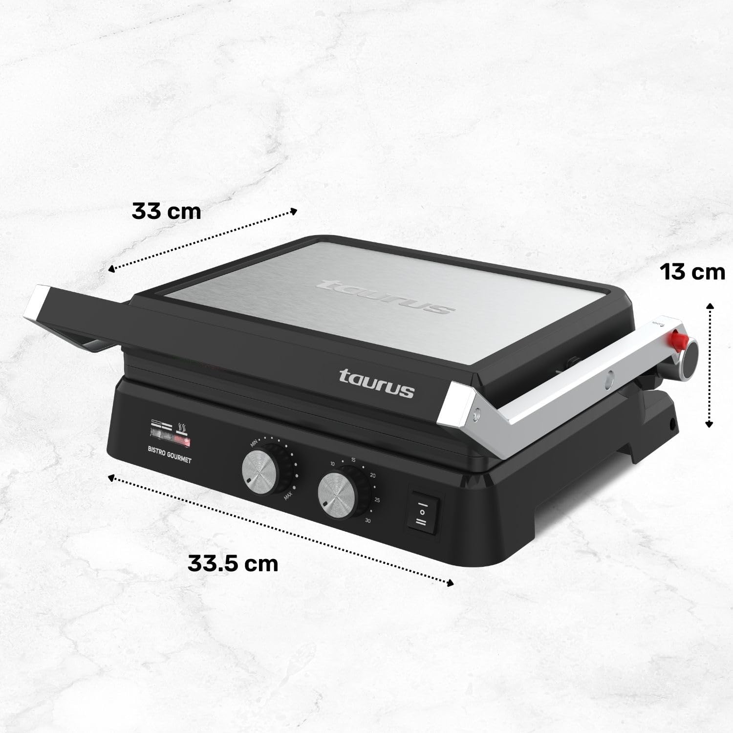 Скарата Taurus Essential е перфектният избор за всеки, който търси гъвкавост и висока производителност в кухнята. С максимална мощност от 2600 W, този 2-в-1 грил и планча осигурява бързо и равномерно готвене. Плочите за грил с размери 29 x 23 см предлагат достатъчно място за приготвяне на няколко ястия едновременно. Благодарение на системата Stair, горната плоча може да се регулира на 5 нива на височина, така че скарата да се адаптира перфектно към различни видове храна. Незалепващото покритие без PFOA предотвратява залепването на храната и улеснява почистването. Подвижна тавичка за събиране на мазнини осигурява чисто печене на скара. Скарата се отваря на 180°, което я прави голяма плоча за грил, а дръжката Cool touch осигурява безопасна работа. Регулируемият термостат позволява прецизен контрол на температурата, а заключването на плочата осигурява допълнителна сигурност. С Taurus Essential Grill приготвянето на здравословни и вкусни ястия е по-лесно от всякога!