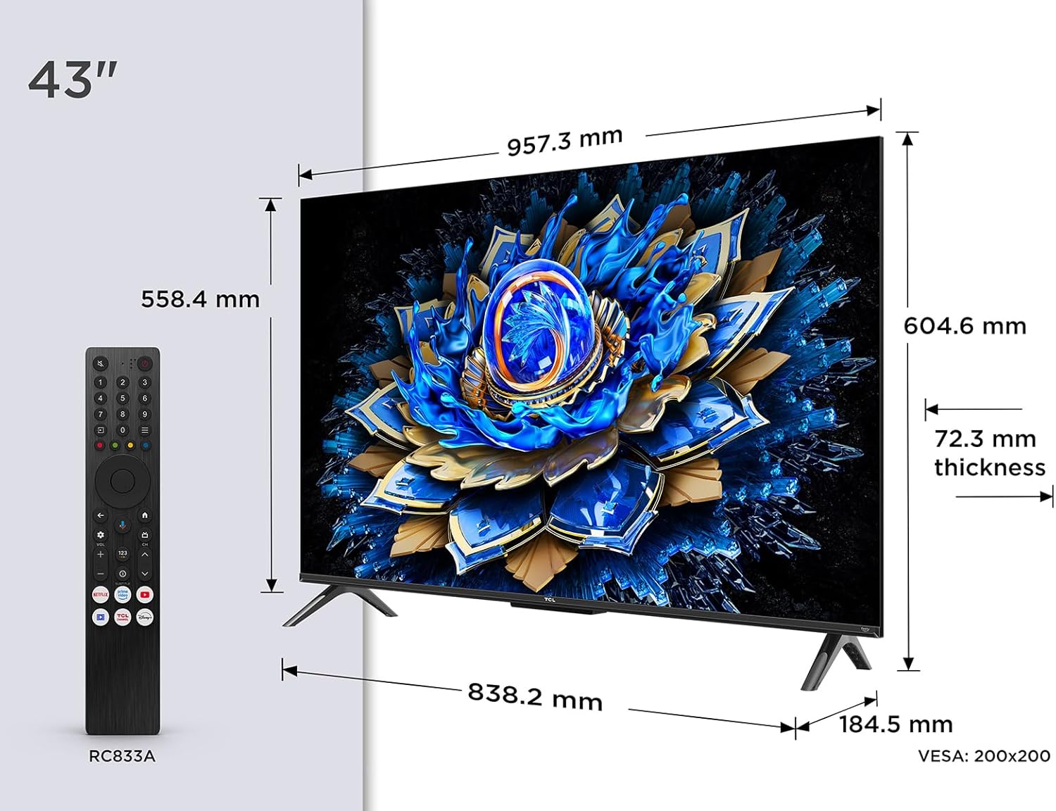 TCL 43T69C 43-инчов QLED, Direct LED телевизор, 4K HDR телевизор, Smart Google TV (Dolby Vision и Atmos, Game Master, Motion Clarity, съвместим с Google Assistant и Alexa)