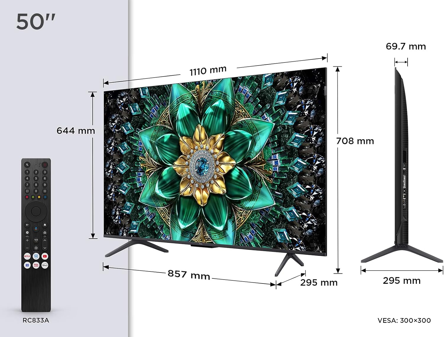 TCL 50-инчов 50Q6C QLED мини LED телевизор, 4K HDR Premium, Dolby Vision IQ и Atmos, Onkyo 2.1, Smart Google TV, Game Master, 144Hz Motion Clarity Pro, AMD FreeSync Premium Pro, HDMI 2.1, AirPlay 2