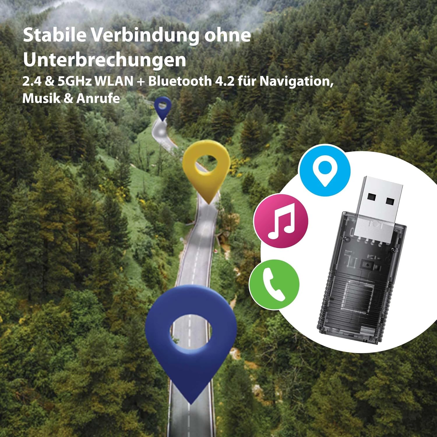 • Стабилна връзка благодарение на двойния Wi-Fi и Bluetooth 4.2: Оборудван с 2.4 GHz + 5 GHz Wi-Fi и Bluetooth 4.2, донгълът предлага бърза и непрекъсната връзка. За плавно стриймване, навигация без забавяне и телефонни разговори без смущения;