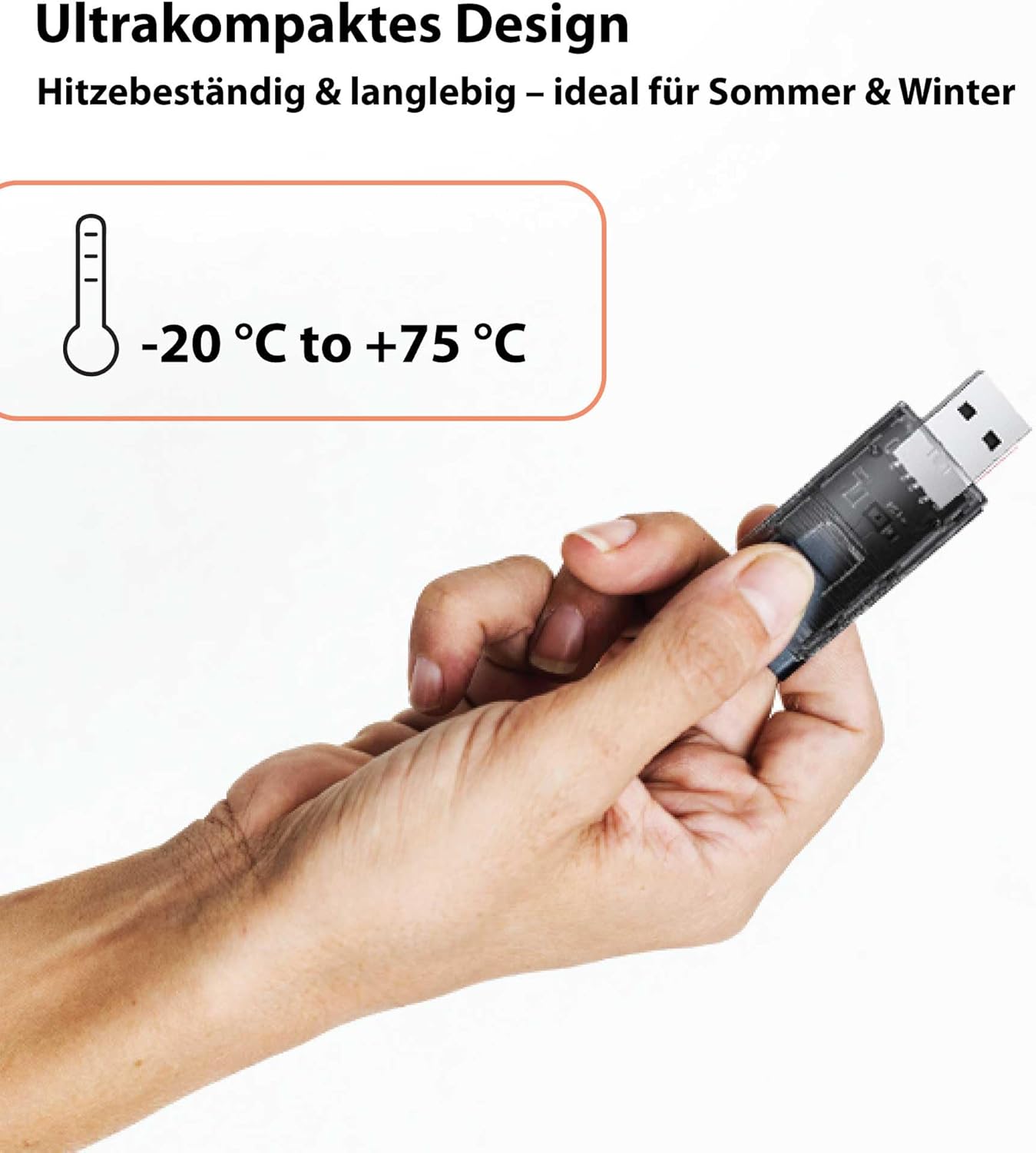 • Ултракомпактен дизайн – устойчив на топлина и дискретен: Размери само 21×50×7 мм – побира се във всяка централна конзола и остава практически невидим. Работен температурен диапазон от -20°C до +75°C – идеален за лято, зима или ежедневна употреба в автомобила.
