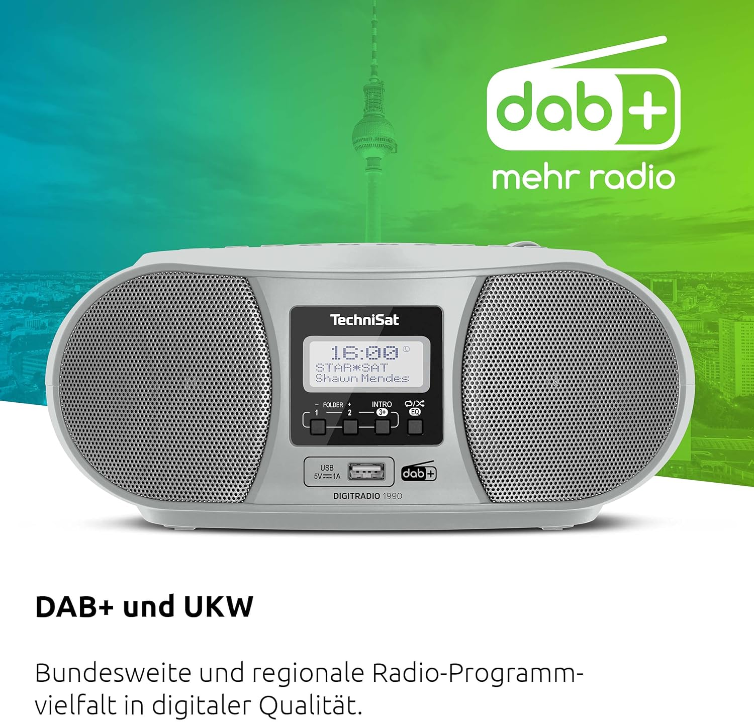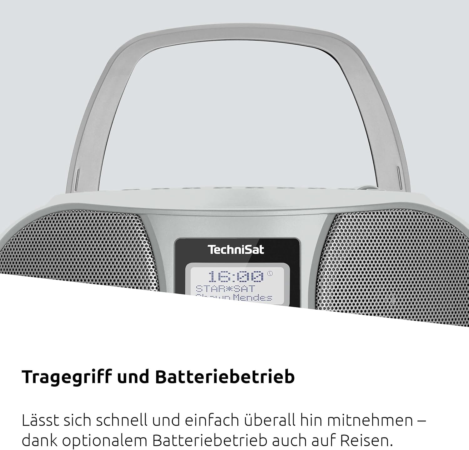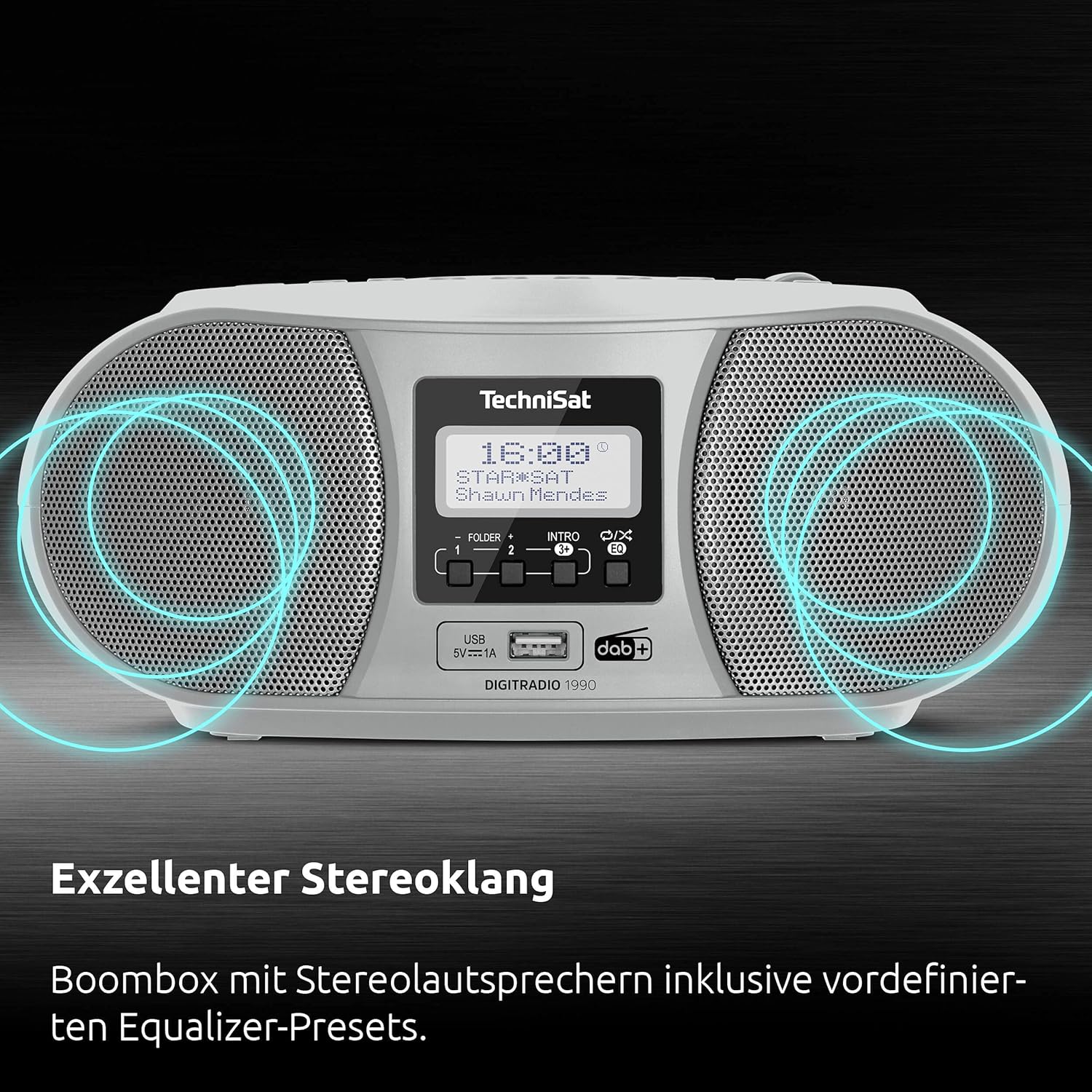 TechniSat Digitradio 1990 Стерео бумбокс с DAB+/FM радио и CD плейър (Bluetooth аудио стрийминг, жак за слушалки, USB, AUX вход, функция зареждане, часовник, 2 x 1.5 вата изходна мощност) Сребърен.