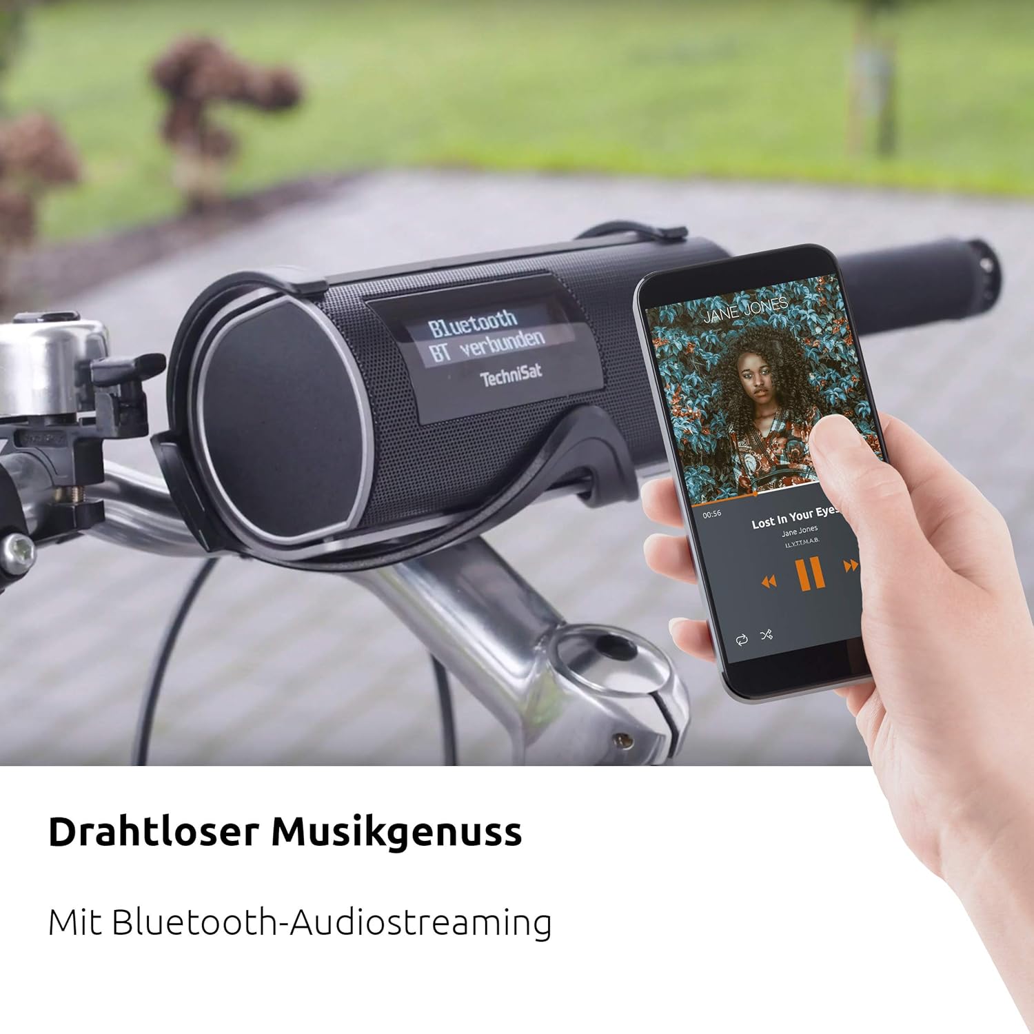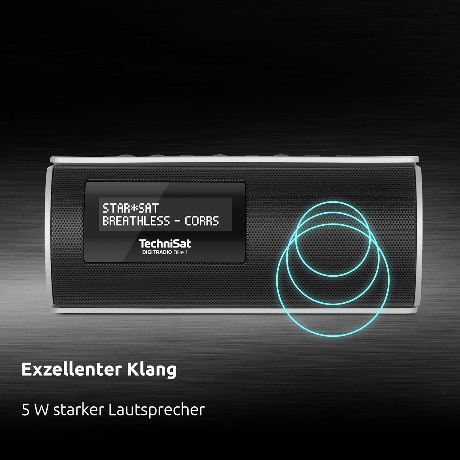 TechniSat DIGITRADIO Bike 1 - DAB+ Велосипедно радио (DAB, FM, водоустойчив корпус IP65, OLED дисплей, Bluetooth аудио стрийминг, универсален държач за кормило/рамка, батерия, 2 вата) Черно/Сребристо