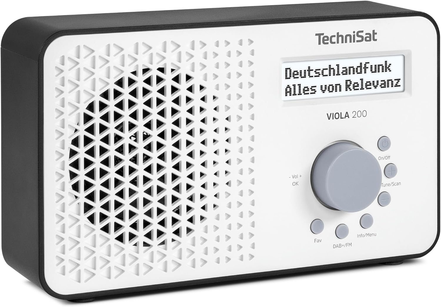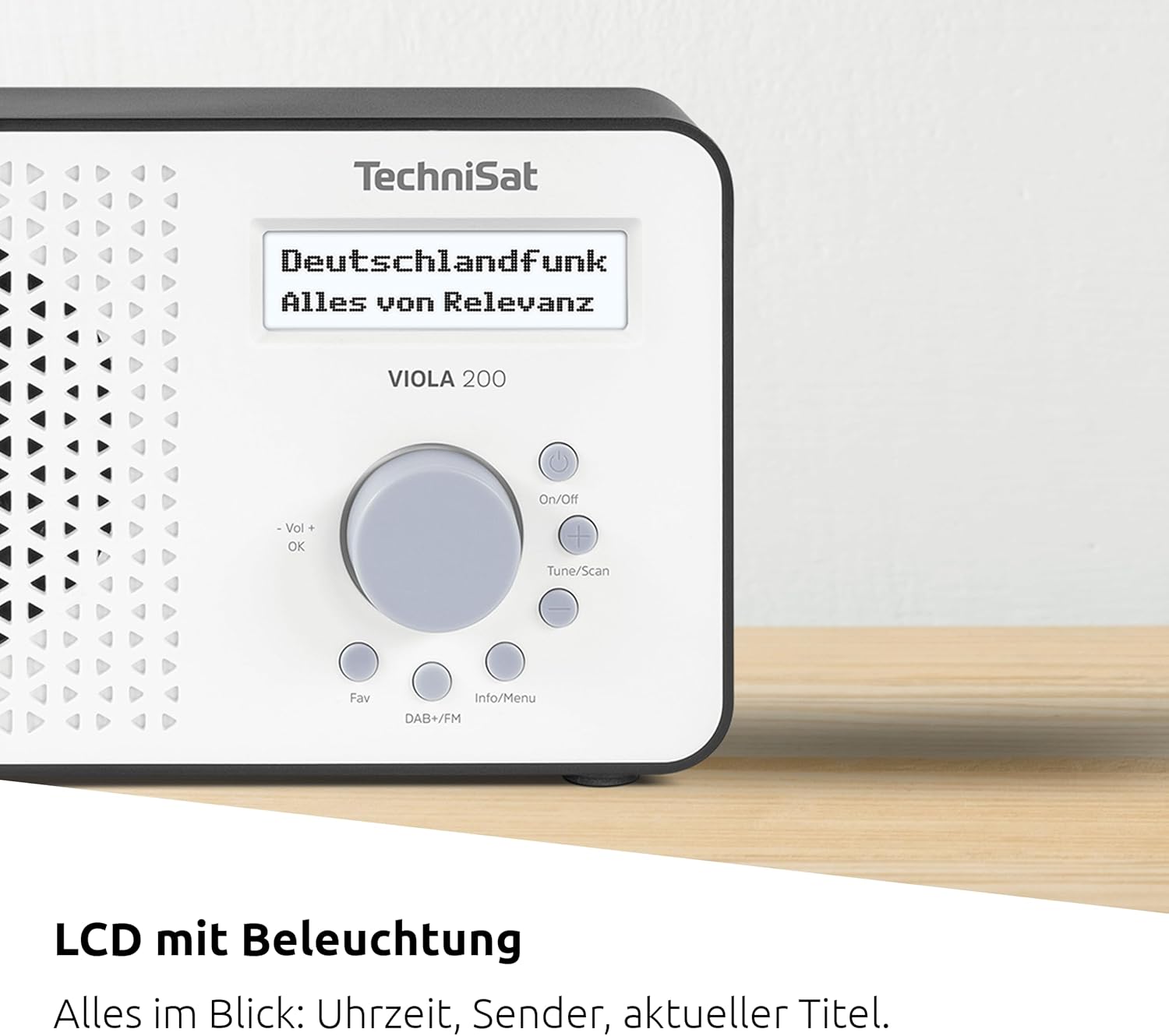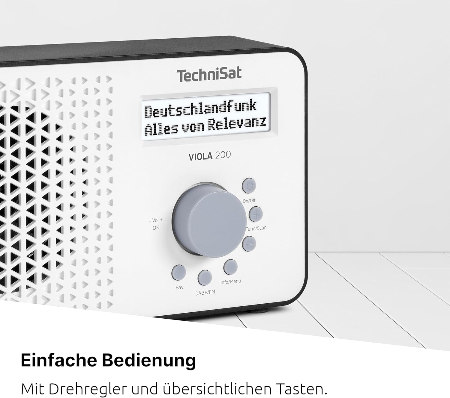TechniSat Viola 200 Преносимо DAB+/FM радио (с LCD дисплей, телескопична антена, памет за любими станции, жак за слушалки, захранване от електрическата мрежа и батерии, моно високоговорител, RDS, PLL) Бяло/Черно