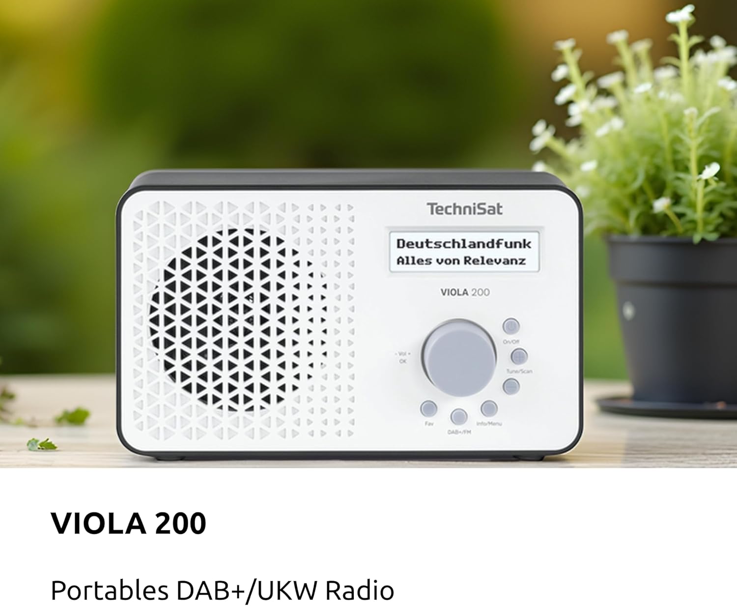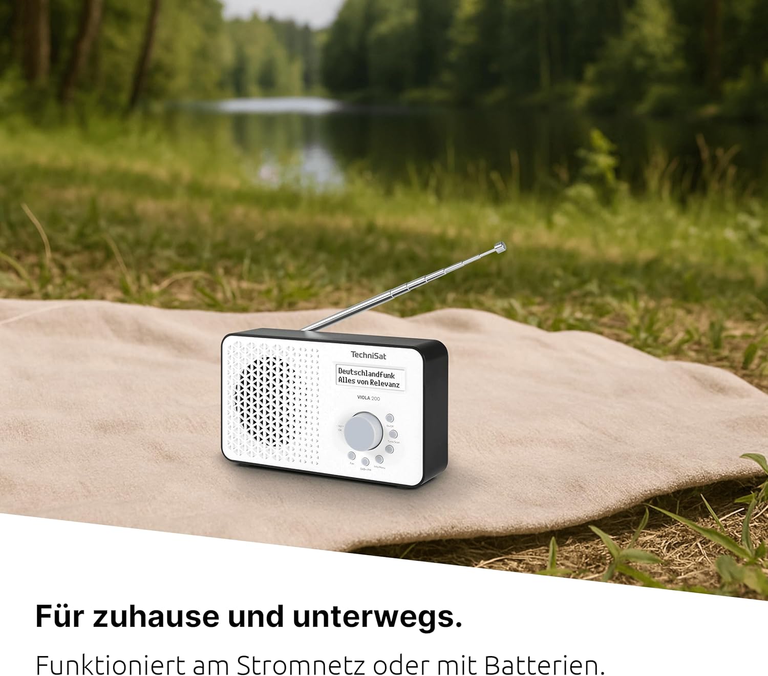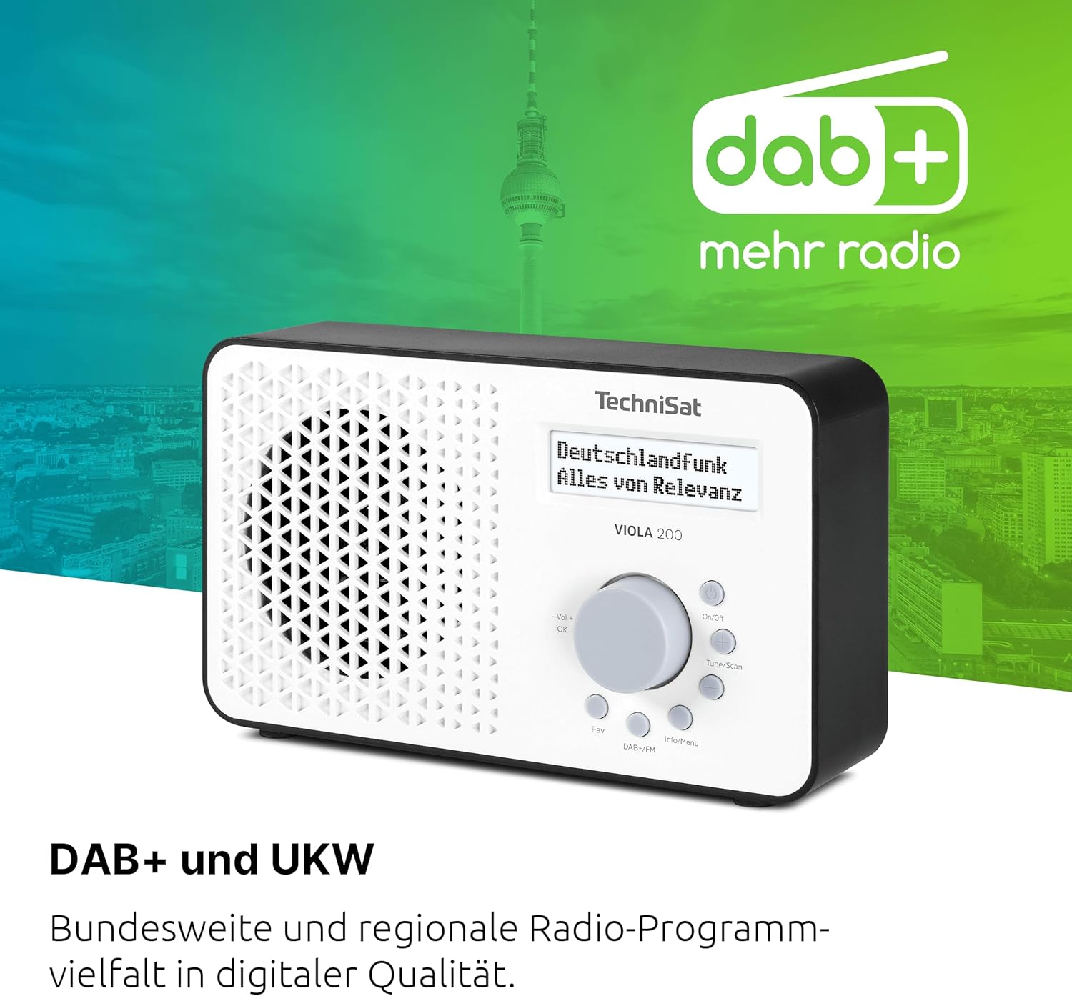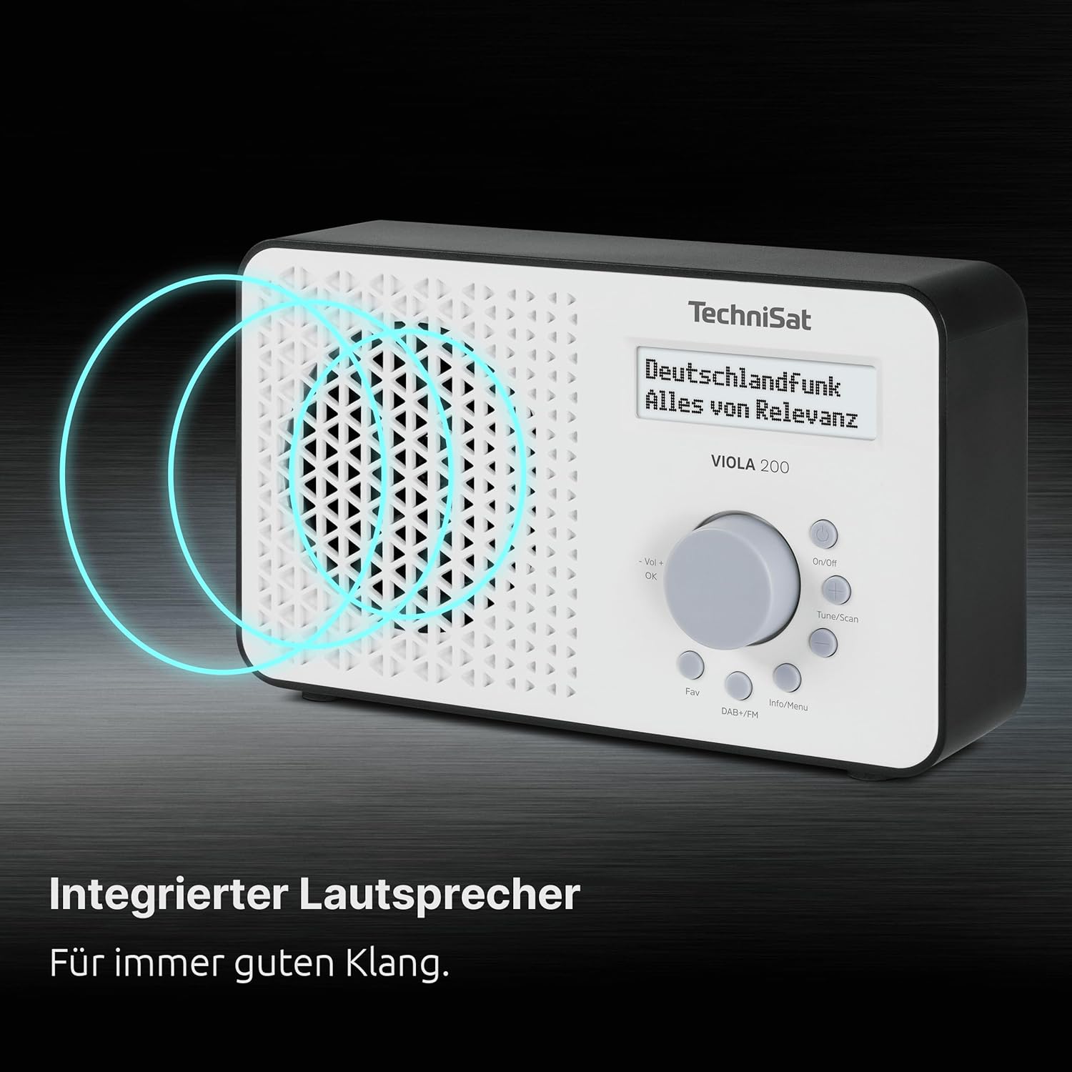 TechniSat Viola 200 Преносимо DAB+/FM радио (с LCD дисплей, телескопична антена, памет за любими станции, жак за слушалки, захранване от електрическата мрежа и батерии, моно високоговорител, RDS, PLL) Бяло/Черно