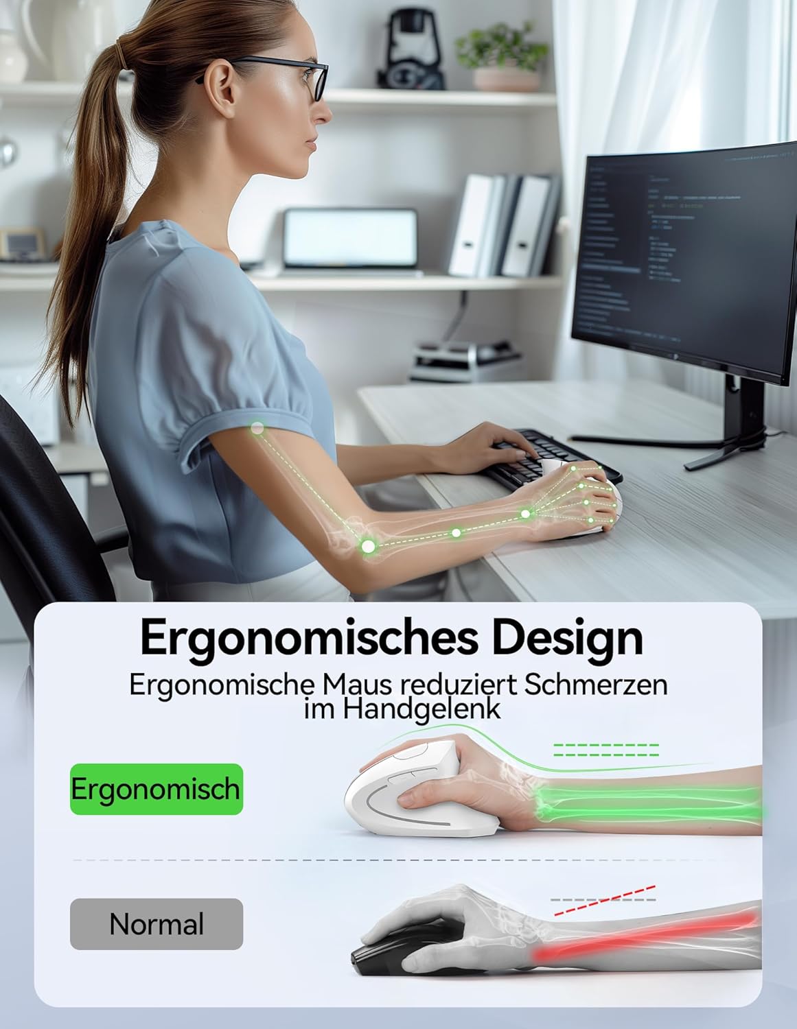 • Ергономичен дизайн: ергономичната мишка може да образува ъгъл от 52° с работния плот. Този вертикален дизайн намалява активността на мускулите на ръката с 10%, позволявайки на ръката и китката да бъдат естествено разположени в удобна позиция, което ефективно намалява умората на ръката, осигурява комфорт и производителност през целия ден.
