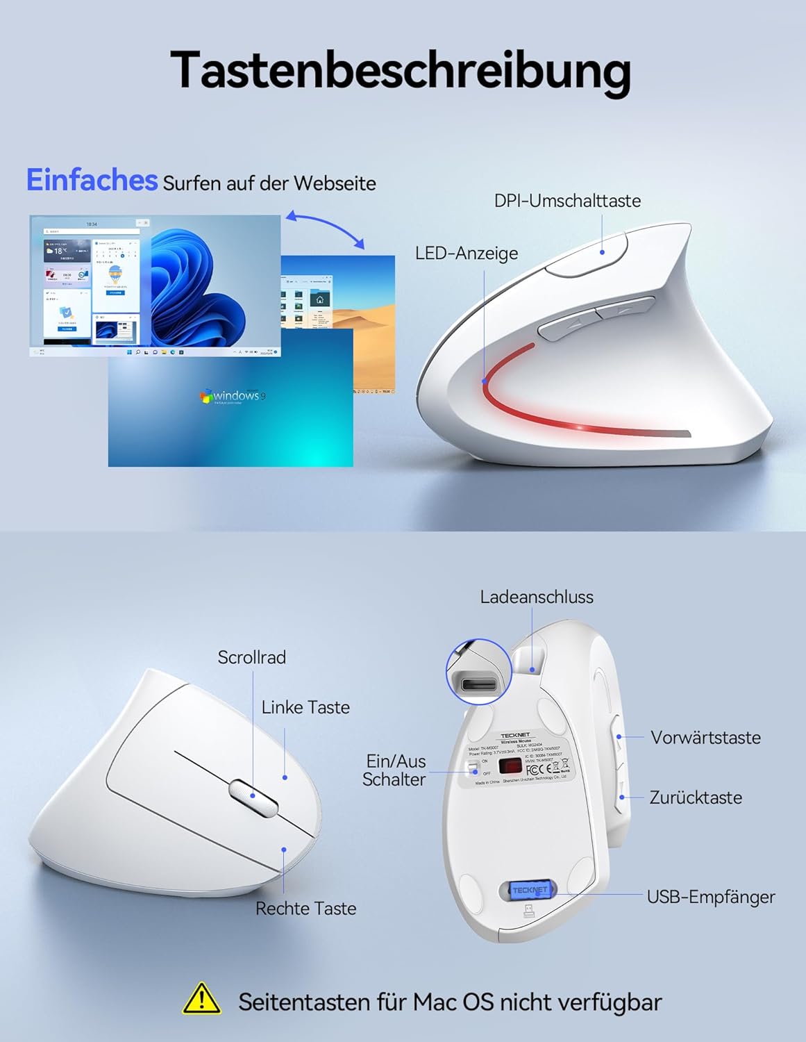 TECKNET Акумулаторна ергономична безжична мишка, 2.4G оптична вертикална мишка, ергономична, 5 нива на регулиране до 4800DPI, тиха безжична вертикална мишка с 6 бутона за лаптоп, компютър, Windows, Mac OS