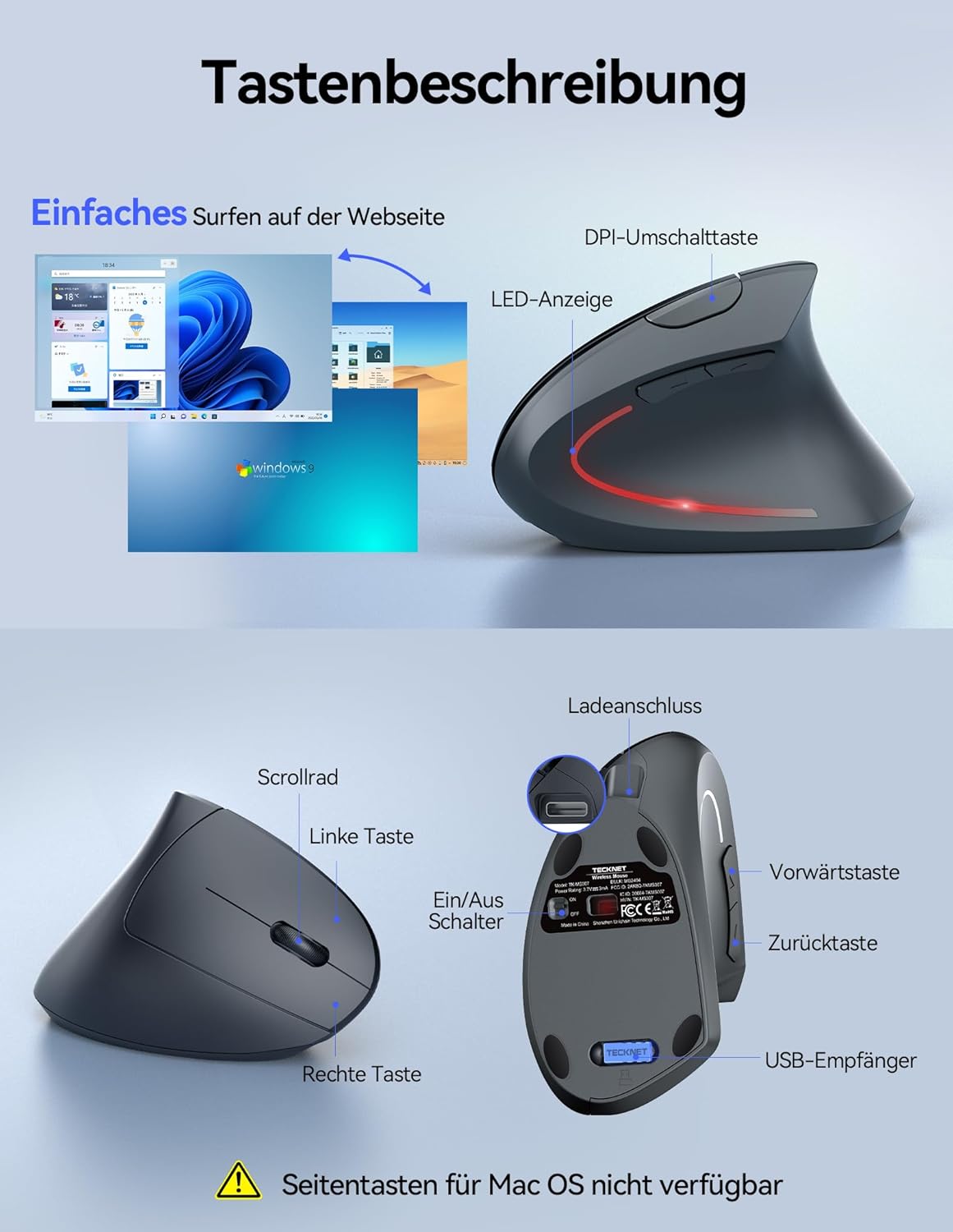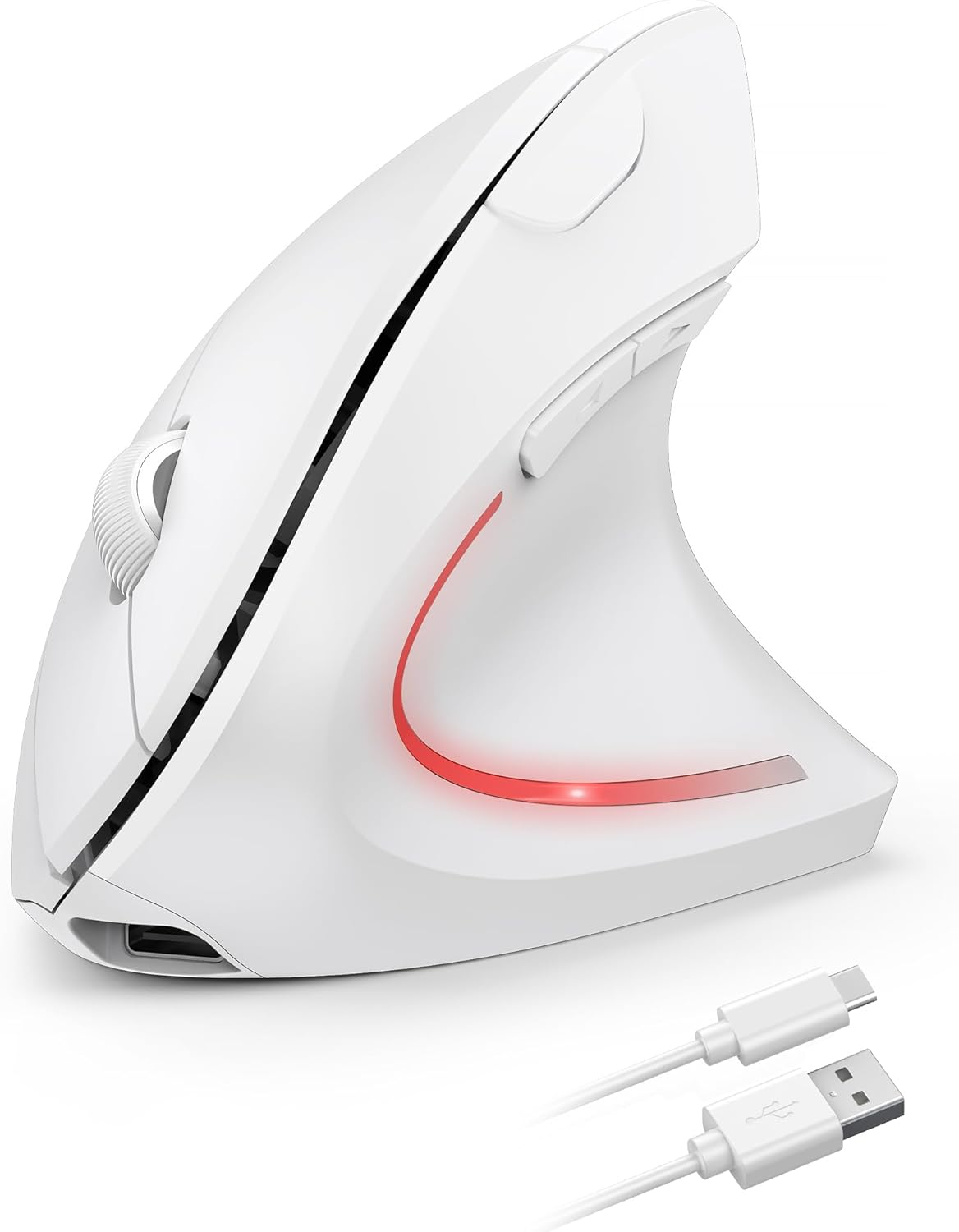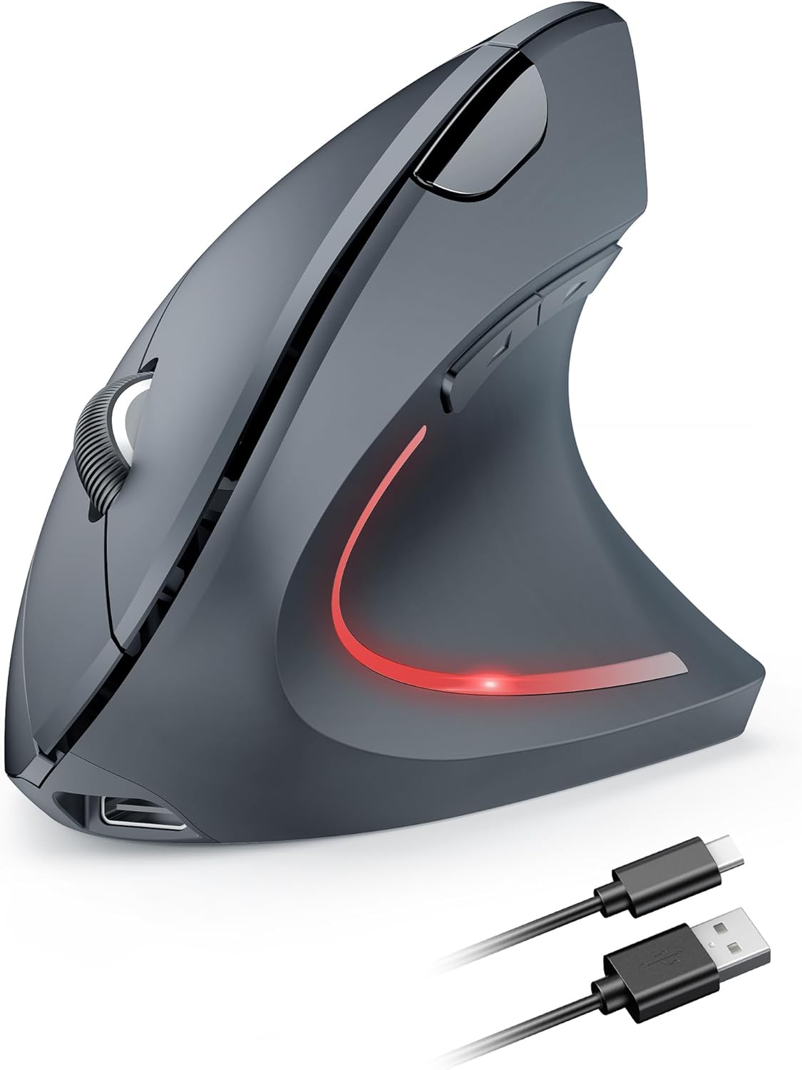 TECKNET Акумулаторна ергономична безжична мишка, 2.4G оптична вертикална мишка, ергономична, 5 нива на регулиране до 4800DPI, тиха безжична вертикална мишка с 6 бутона за лаптоп, компютър, Windows, Mac OS
