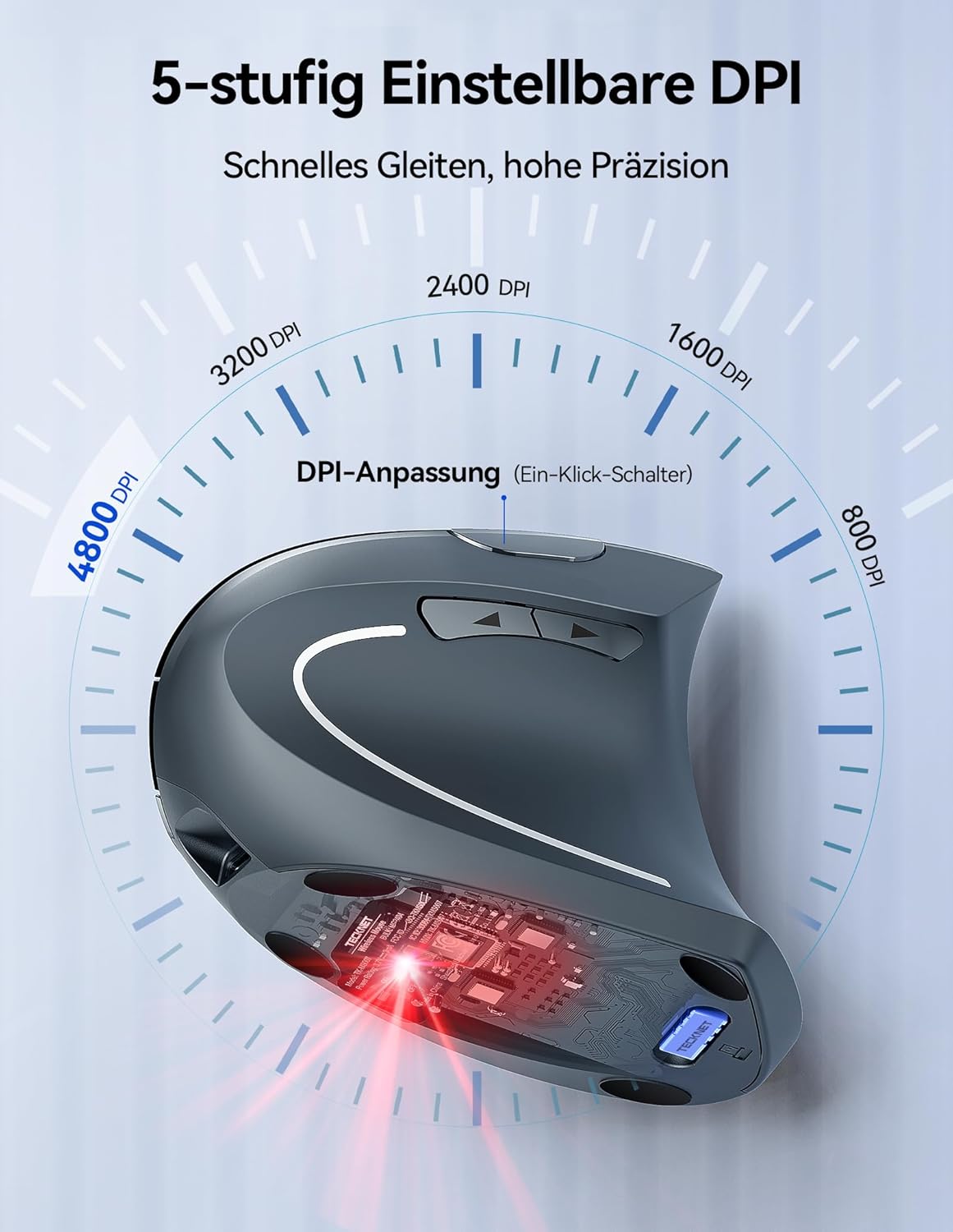 • 5 регулируеми DPI: вертикалната мишка с нива на DPI 4800/3200/2400/1600/800. 5 регулируеми DPI настройки и дискриминационната оптична технология за проследяване осигуряват по-висока чувствителност от традиционните оптични мишки. Тази технология осигурява плавно проследяване върху различни повърхности и отговаря на вашите ежедневни нужди. Когато промените нивото на DPI, светлината мига, броят на миганията съответства на избраното ниво на DPI.