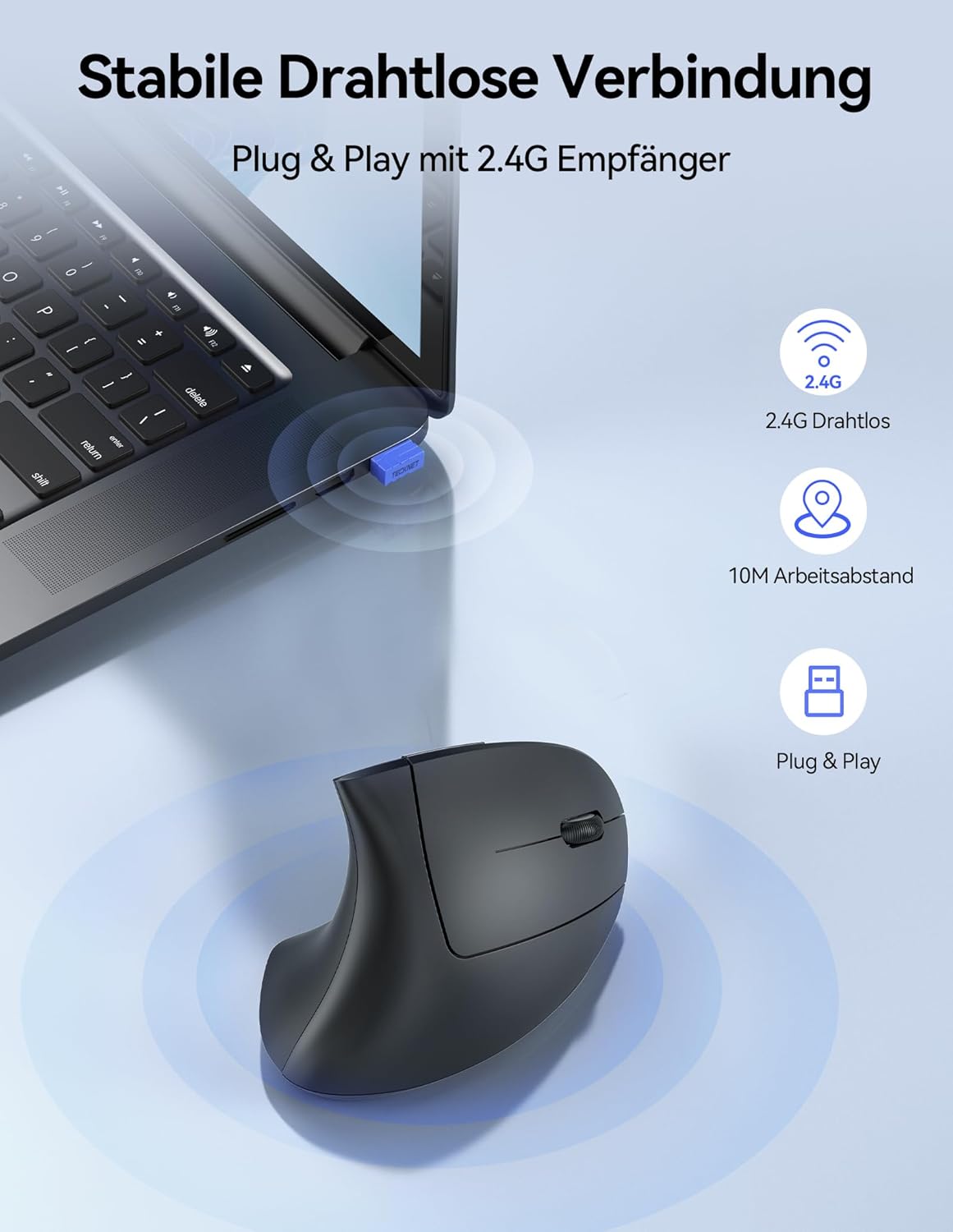 • Безжична свобода: Тази вертикална безжична мишка е с усъвършенствана 2,4 GHz безжична технология и може да работи стабилно и бързо на разстояние от 10 м без смущения.