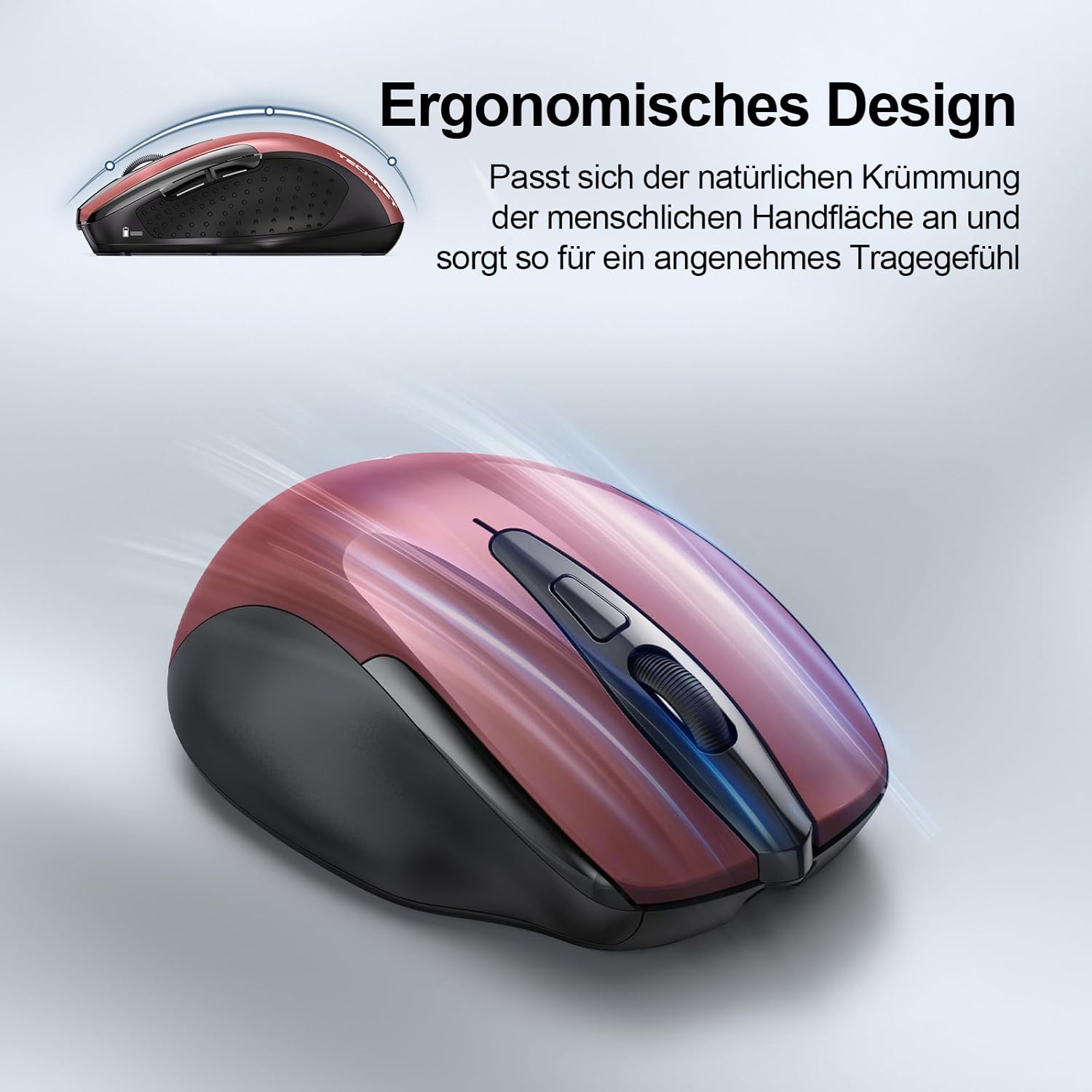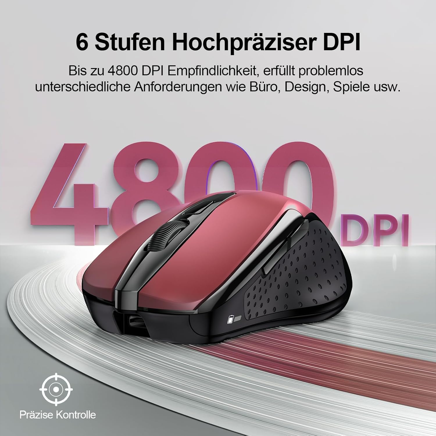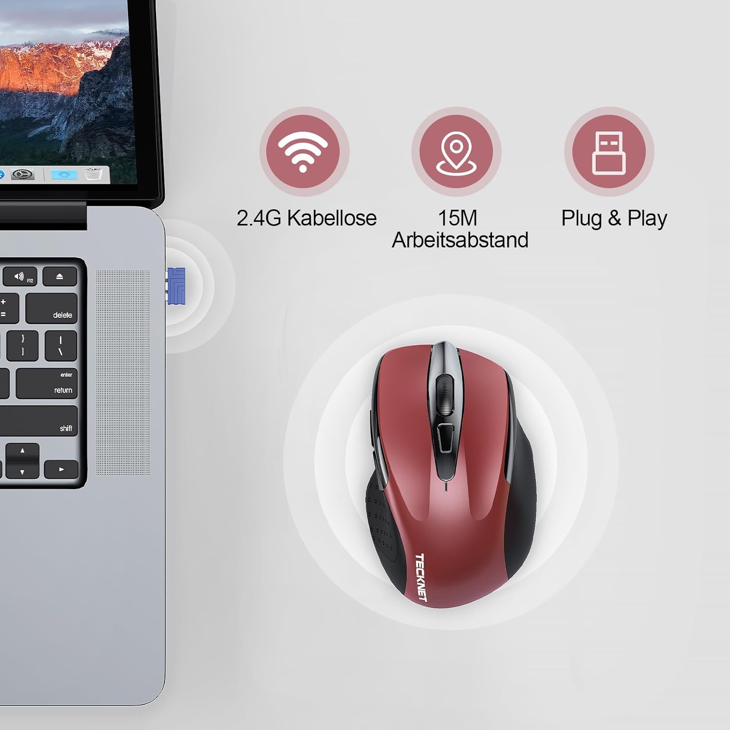 TECKNET Безшумна безжична мишка, Акумулаторна безжична мишка 4800 DPI 2.4GHz Оптична компютърна мишка за лаптоп, PC, Mac, 6 бутона, Червена