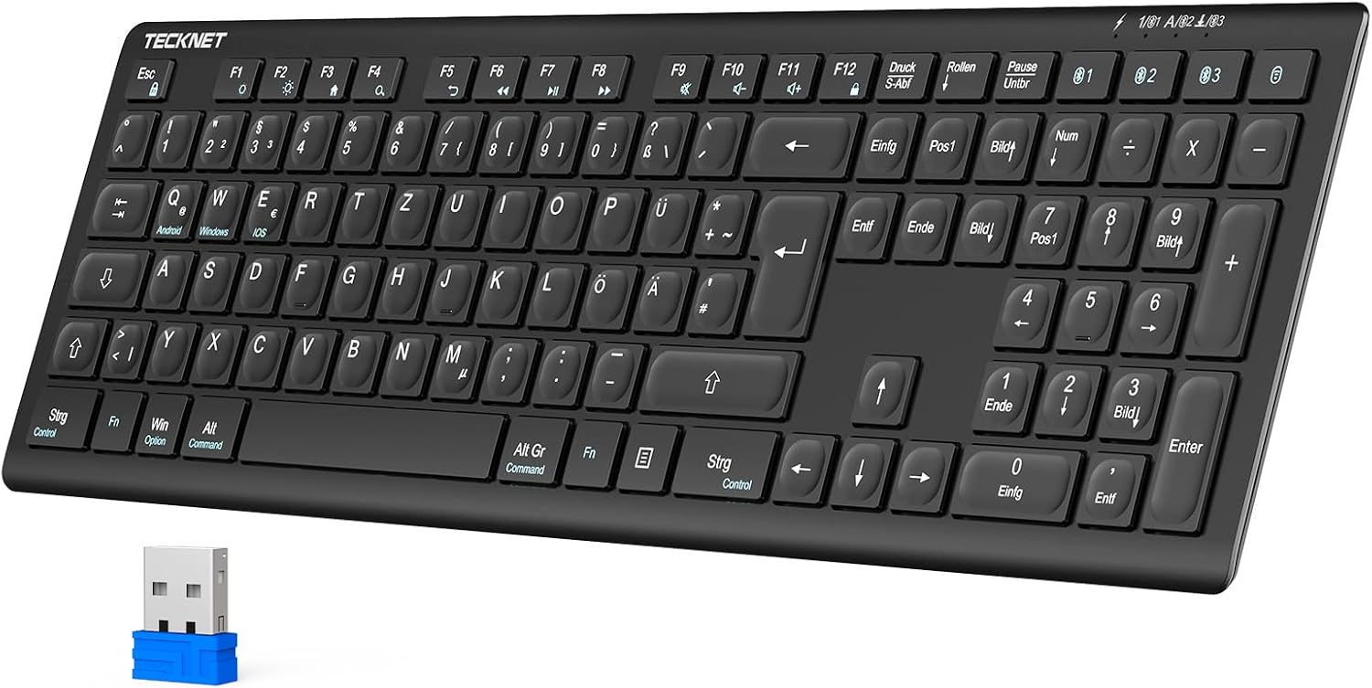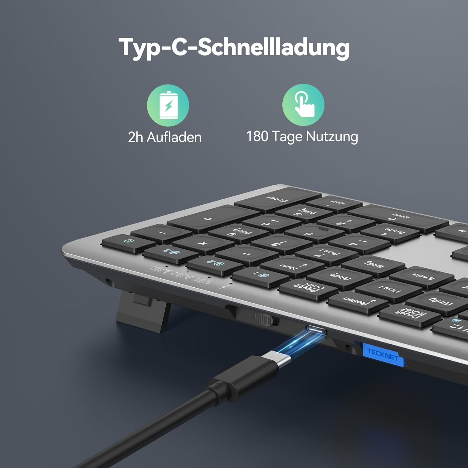 TECKNET Bluetooth клавиатура, безжична презареждаща се клавиатура за множество устройства с лесна поддръжка до 4 устройства, ултра тънка, немска подредба (QWERTZ), за Mac, Windows, iOS, Chrome OS