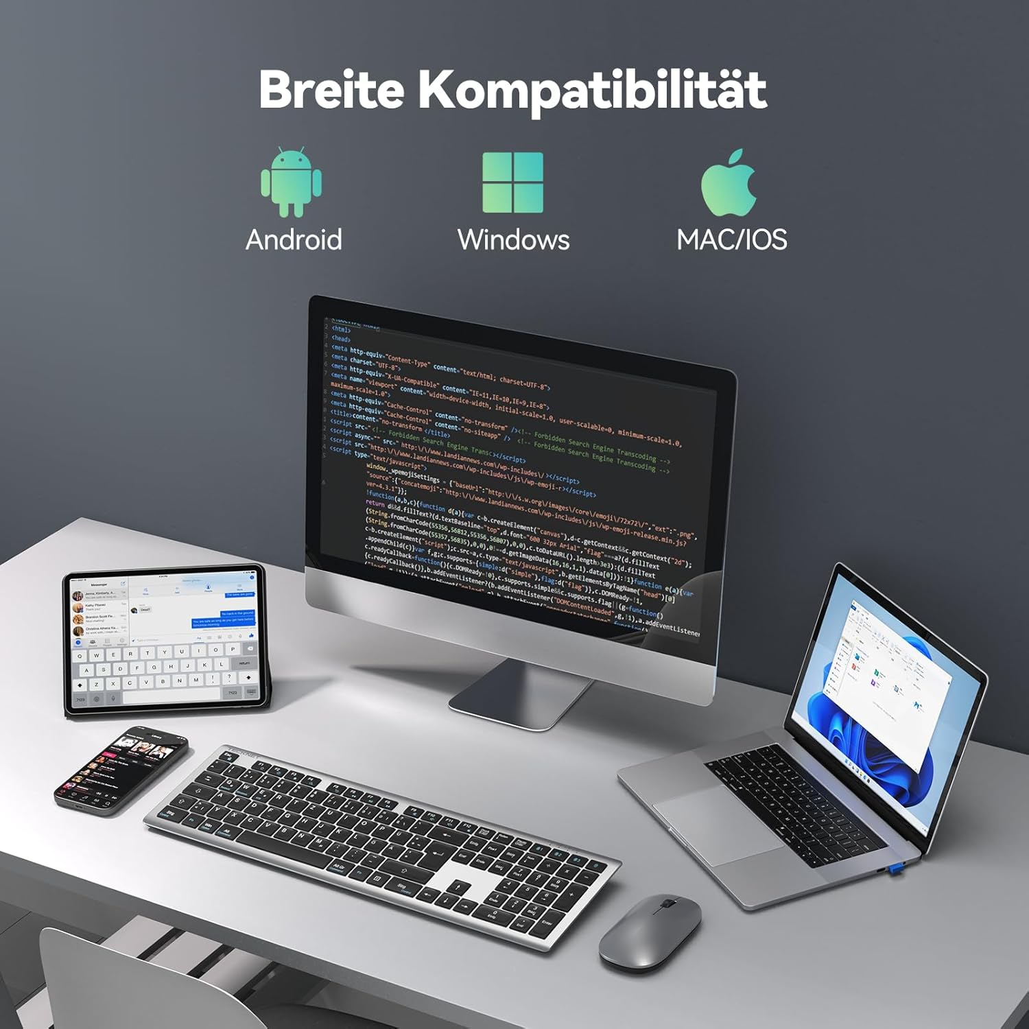 • Широка съвместимост: Bluetooth клавиатурата TECKNET с пълноразмерна цифрова подложка е съвместима с Windows, iOS, macOS и Android и е идеална за различни устройства, включително iPad, таблети, смартфони, лаптопи, настолни компютри и смарт телевизори. За устройства без Bluetooth, просто използвайте включения USB приемник за стабилна връзка.