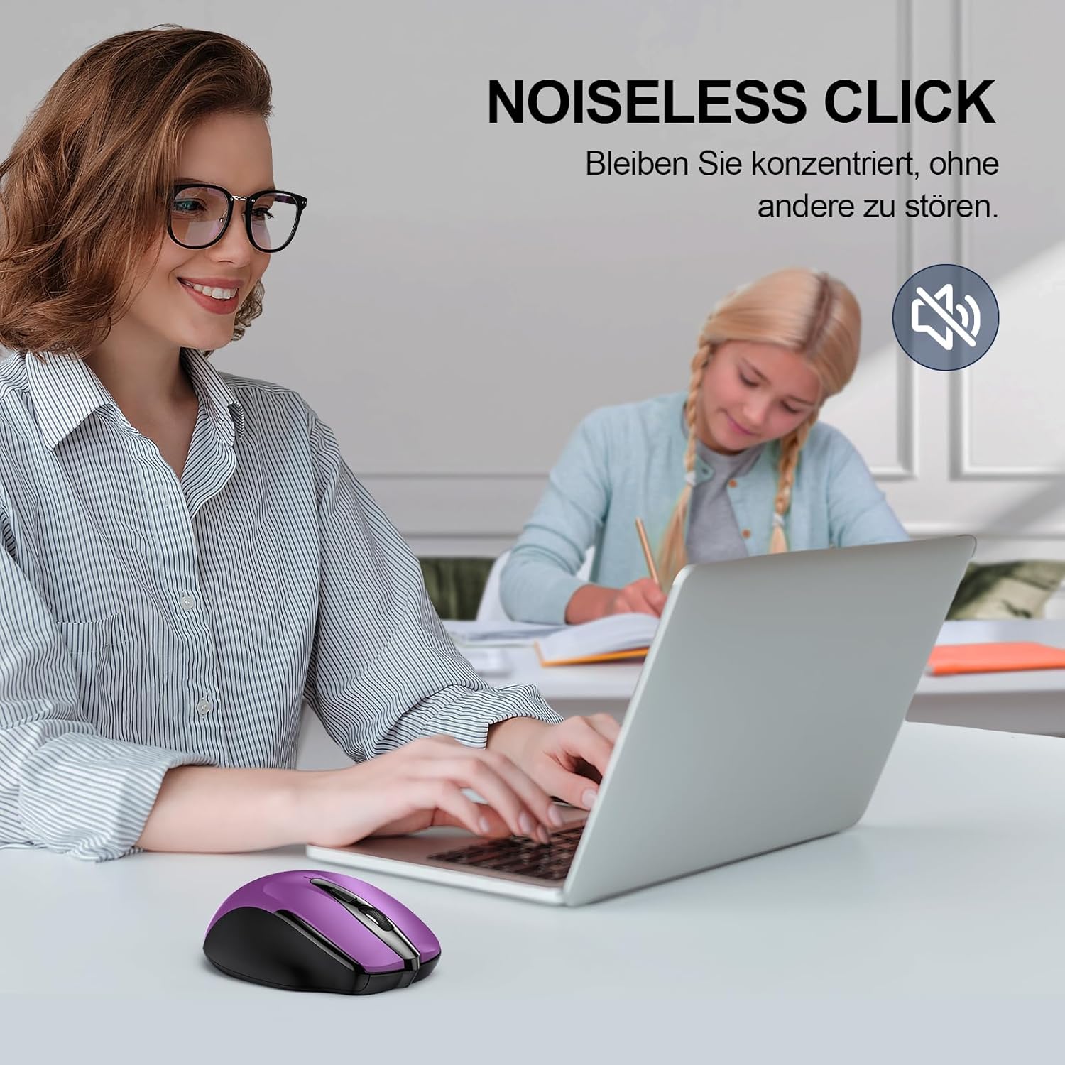 • ТИХ ДИЗАЙН: Безшумният дизайн на тази безжична Bluetooth мишка намалява шума с до 90%, което я прави идеална за библиотеки, офиси, домашни офиси или кафенета, където не искате да безпокоите другите. (Забележка: Само левият, десният и средният първичен клавиш поддържат безшумни кликвания.)