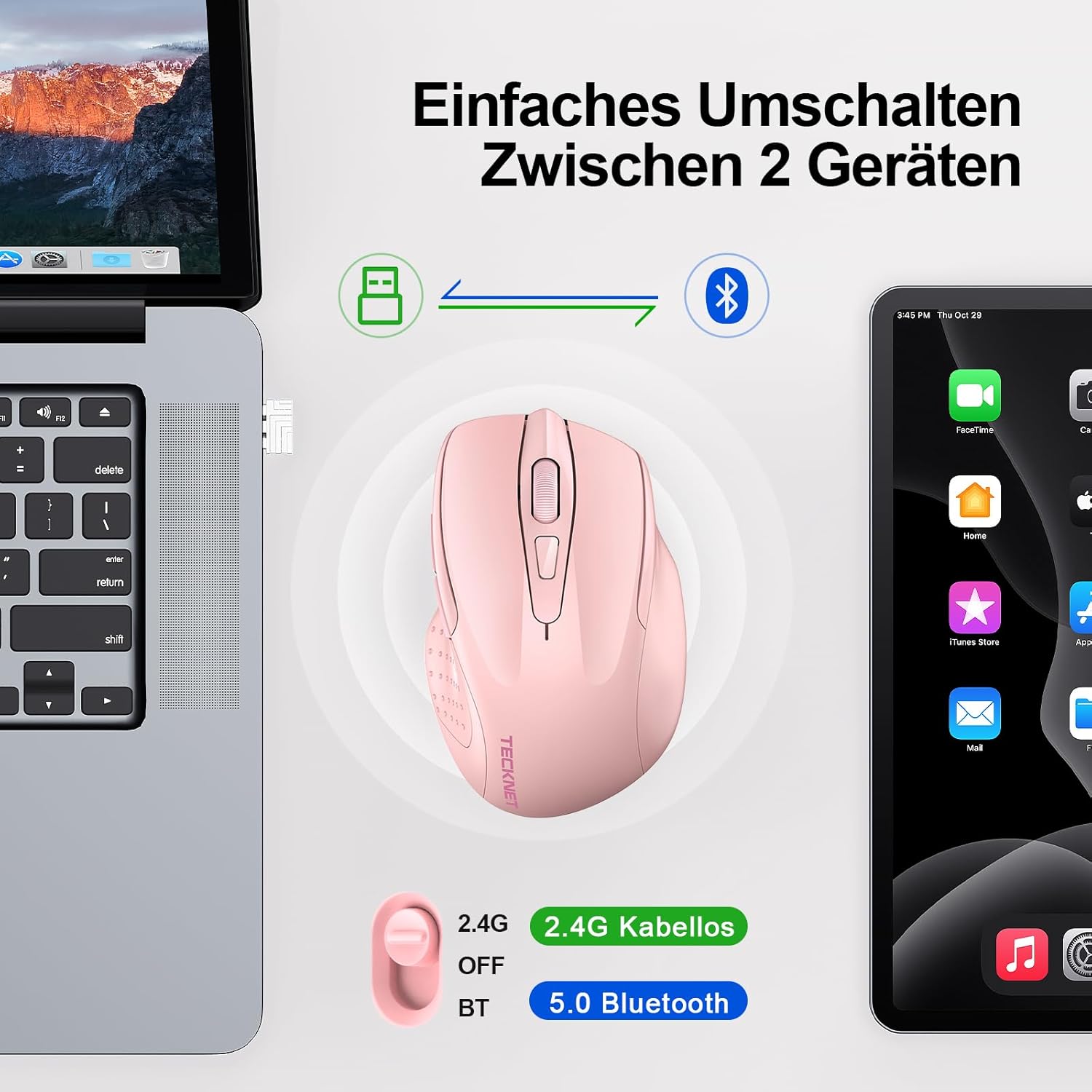 • Свържете 2 устройства едновременно: безжичната Bluetooth мишка с 3 режима (BT5.0 и BT3.0 + 2.4GHz) може да превключва между 2 устройства чрез бутона за превключване на компютърната мишка. Това улеснява превключването от настолен компютър към лаптоп или таблет към MacBook или Chromebook.