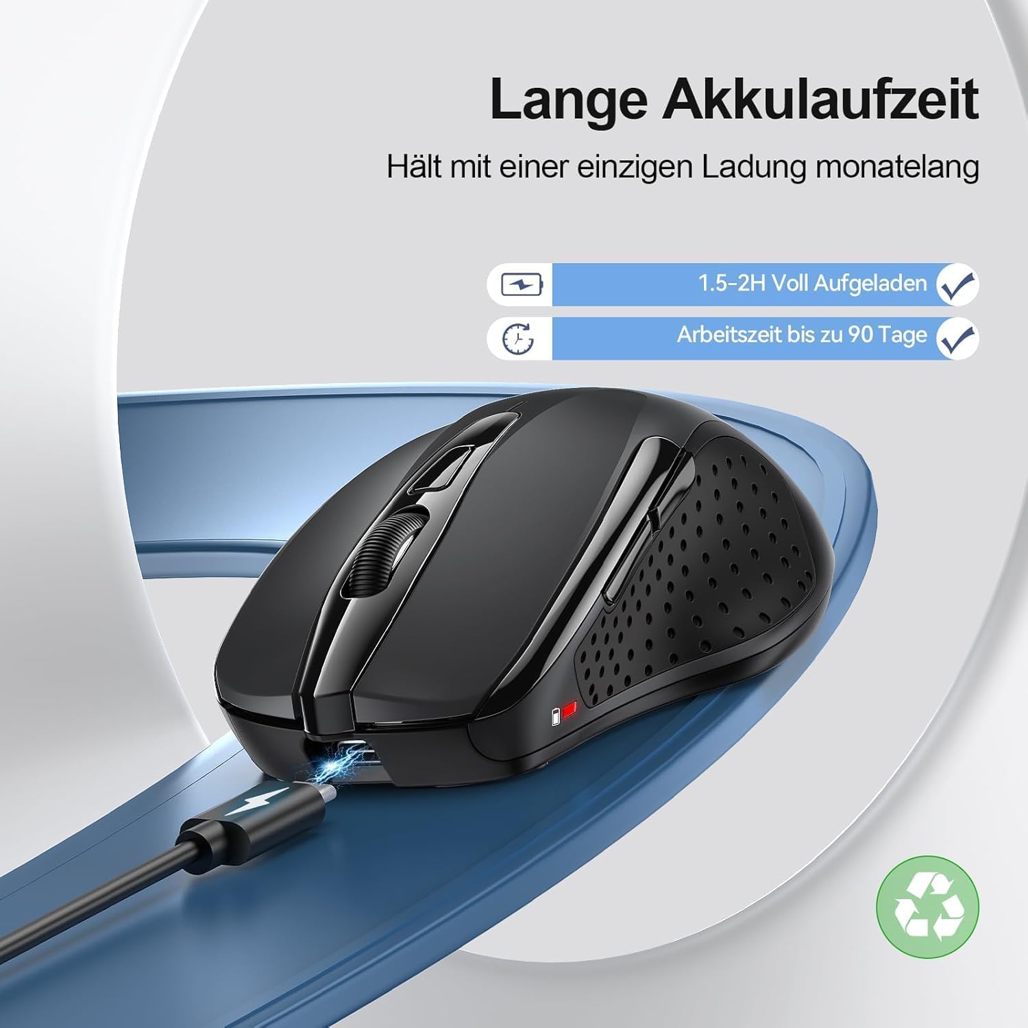 TECKNET Bluetooth мишка, презареждаща се безжична Bluetooth мишка (три режима: BT 5.0/3.0 + 2.4G), 4800 DPI, ергономична тиха безжична мишка за лаптопи, Mac OS, Android, Windows, черна