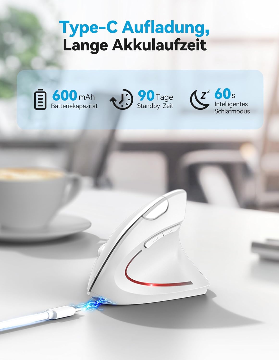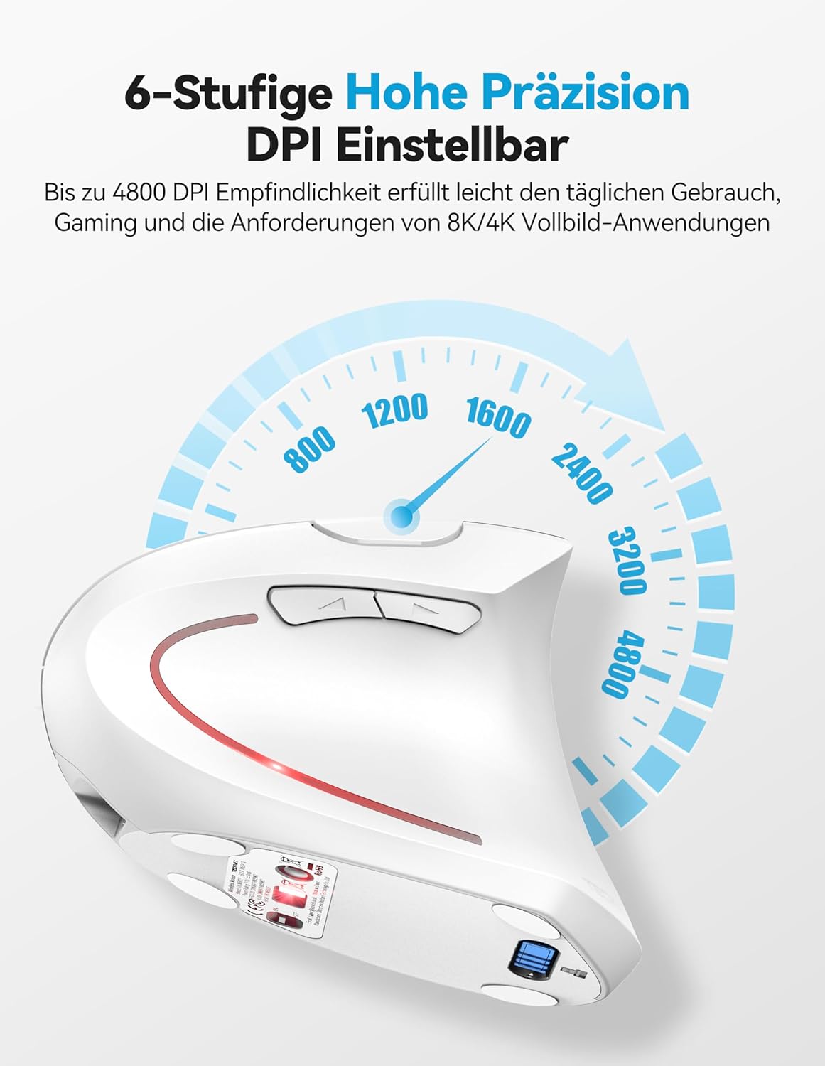 TECKNET Ергономична Bluetooth мишка, Акумулаторна безжична вертикална мишка (BT 5.0/3.0 + 2.4G), 6 нива на регулиране до 4800 DPI, Оптична тиха безжична мишка за Windows, MacOS, Android, iPadOS, Бяла