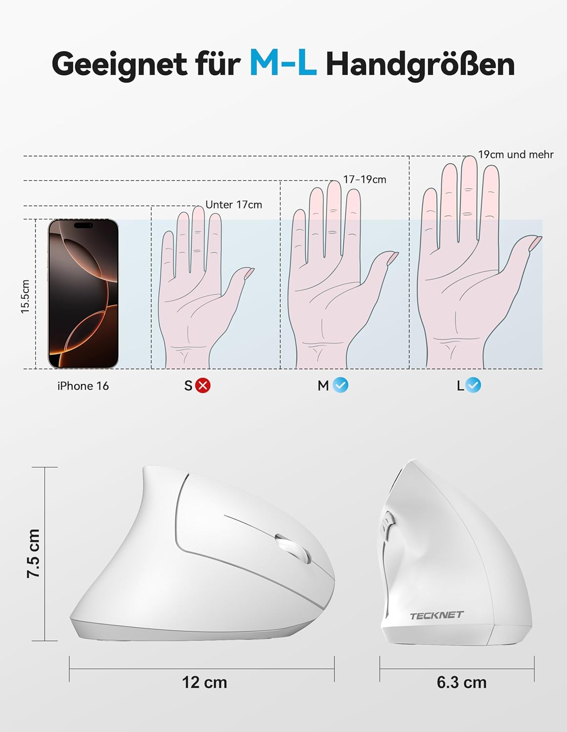 • ИДЕАЛНА ЗА СРЕДНИ ДО ГОЛЕМИ РЪЦЕ: Безжичната презареждаща се мишка TECKNET е предназначена за средни до големи десничари. Тази вертикална мишка е с размери 4,73 x 2,96 x 2,48 инча (12 x 7,5 x 6,3 см). За оптимален комфорт препоръчваме да измерите ръката си преди покупка (вижте изображението на продукта за насоки).