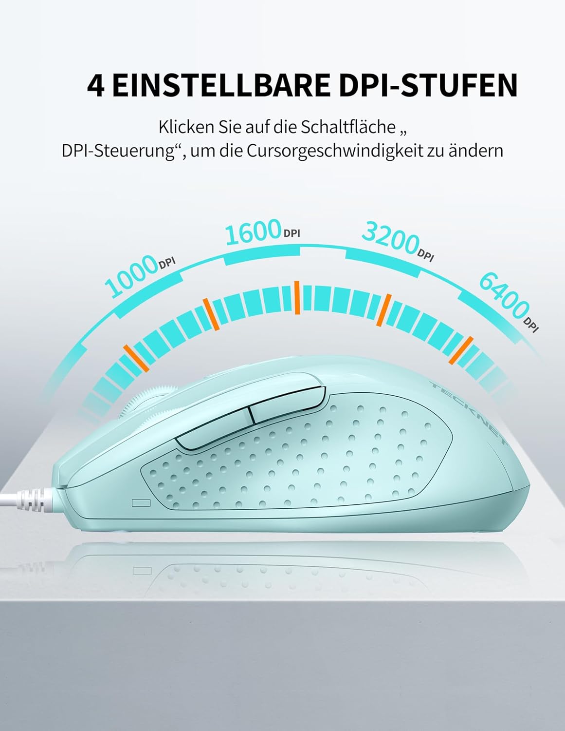 • ПРЕЦИЗЕН КОНТРОЛ: Кабелната компютърна мишка TECKNET осигурява прецизен и интелигентен контрол и проследяване на курсора върху различни повърхности. Четири регулируеми нива на DPI (6400/3200/1600/1000) могат да се превключват по желание, за да отговорят на вашите ежедневни и професионални нужди.