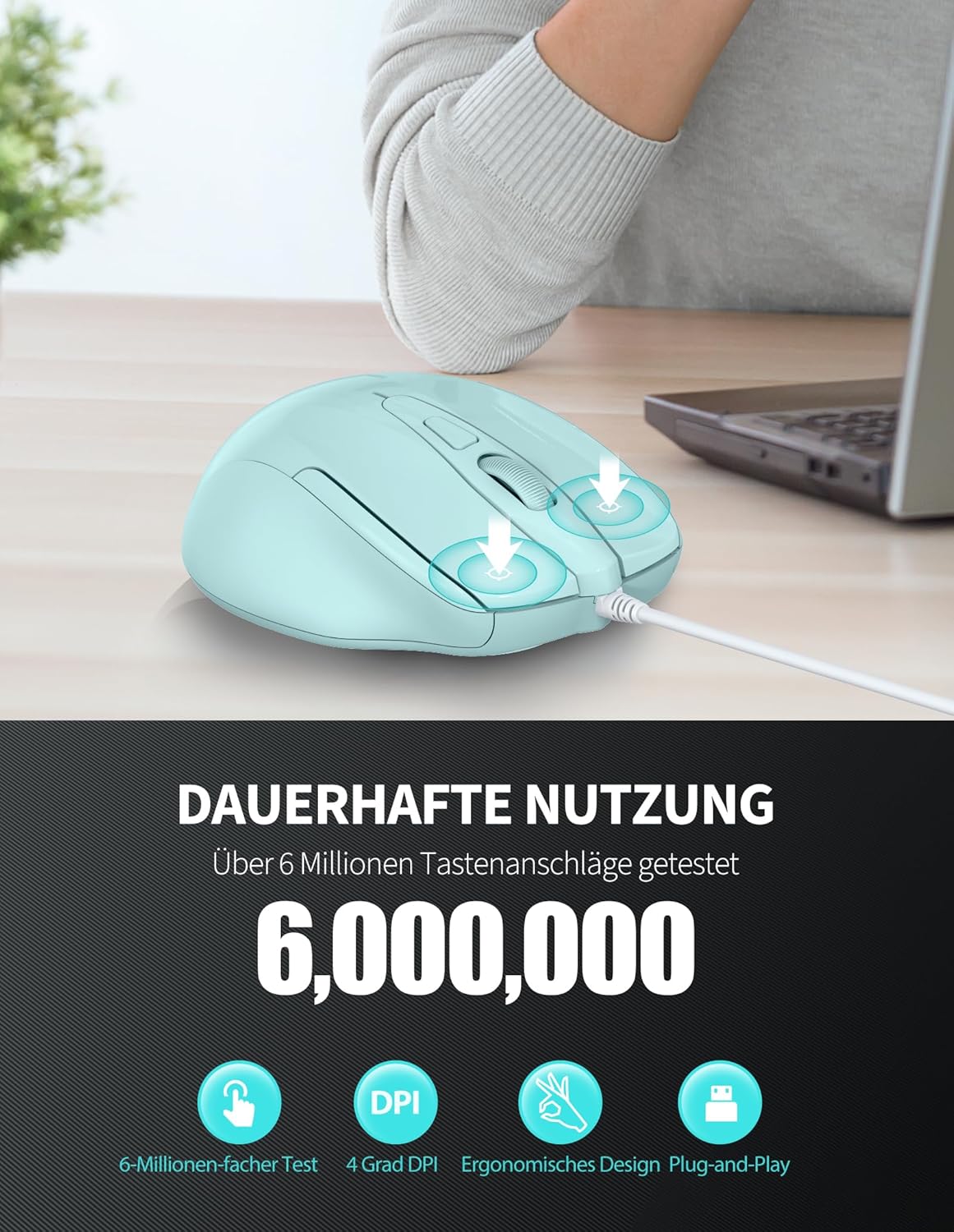 • Тихи и издръжливи: левият и десният бутон са безшумни, което е много подходящо за чувствителни към шум офиси, библиотеки или нощна работа. Бутоните могат да издържат на 6 000 000 кликвания, надеждни и издръжливи са за по-дълъг експлоатационен живот.