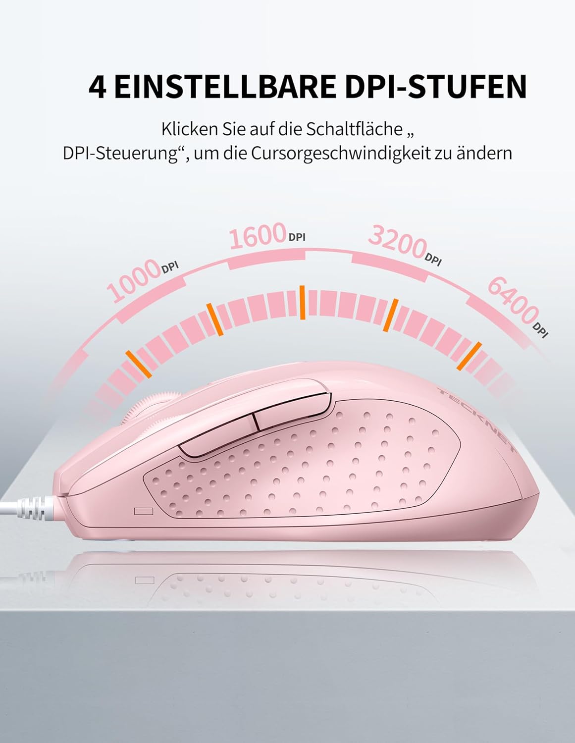 • ПРЕЦИЗЕН КОНТРОЛ: Кабелната компютърна мишка TECKNET осигурява прецизен и интелигентен контрол и проследяване на курсора върху различни повърхности. Четири регулируеми нива на DPI (6400/3200/1600/1000) могат да се превключват по желание, за да отговорят на вашите ежедневни и професионални нужди.