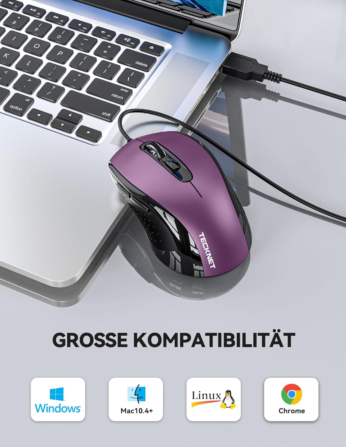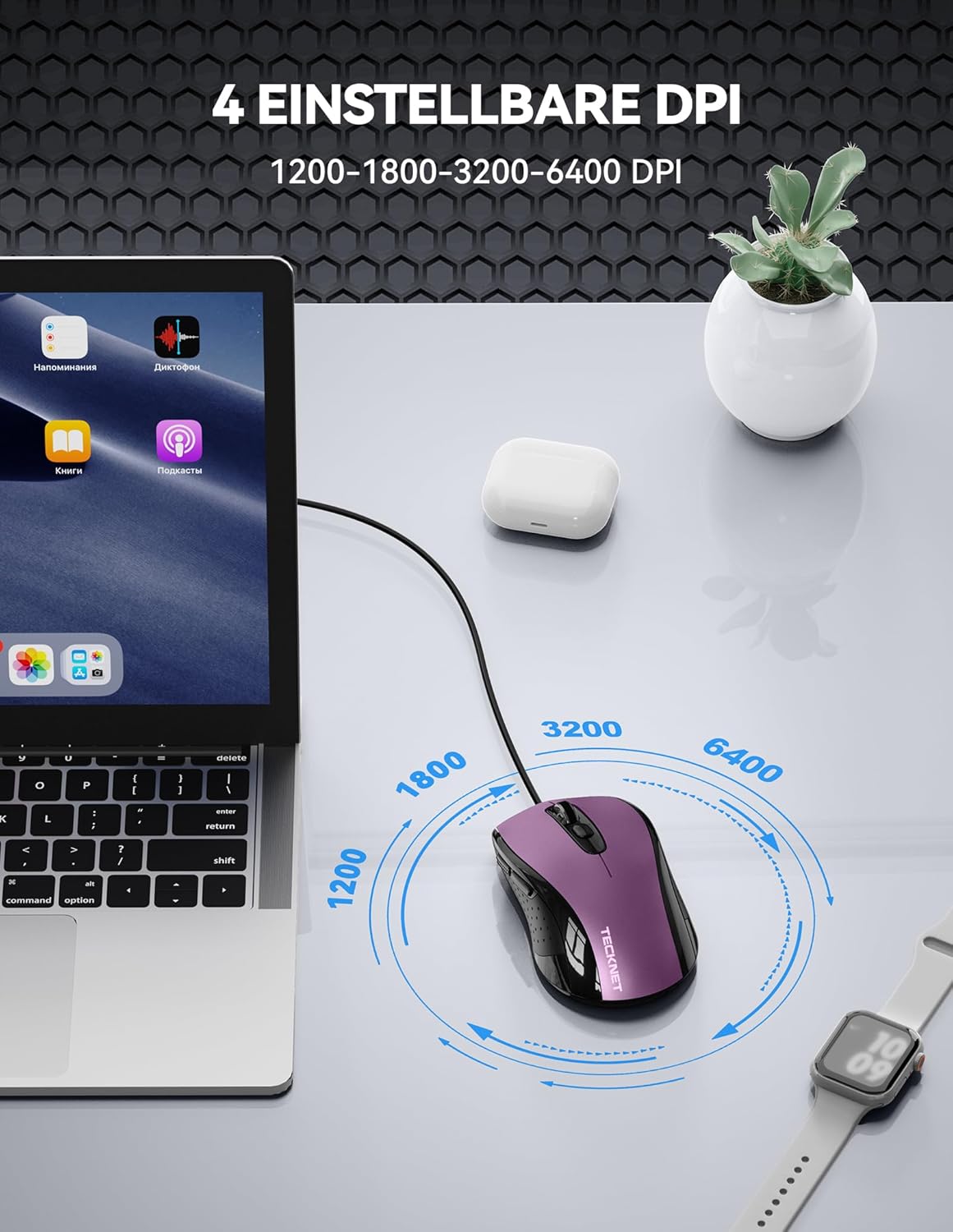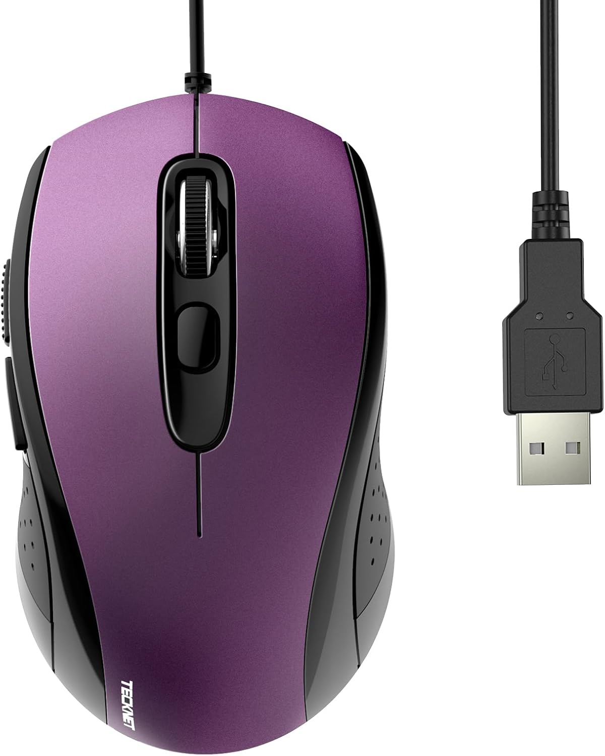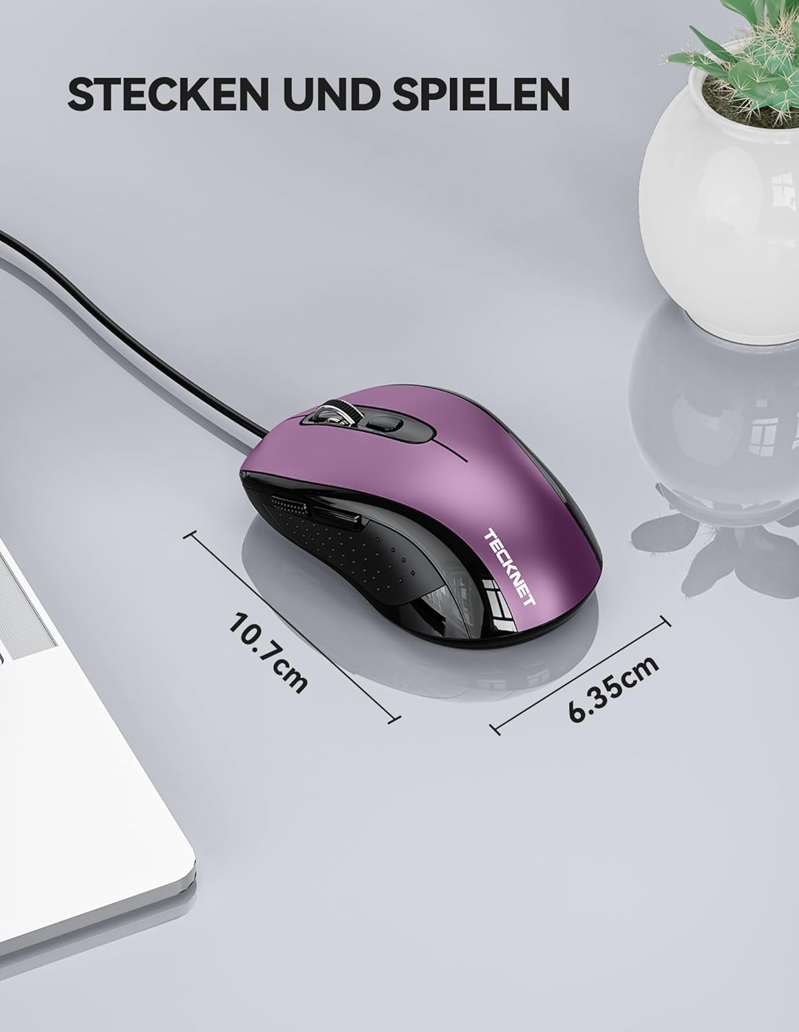 TECKNET Кабелна мишка, 6400DPI Оптична бизнес мишка Ергономична кабелна мишка с 6 бутона, 4 регулируеми нива на DPI, USB Plug & Play, за лаптоп/PC/Mac - Лилава