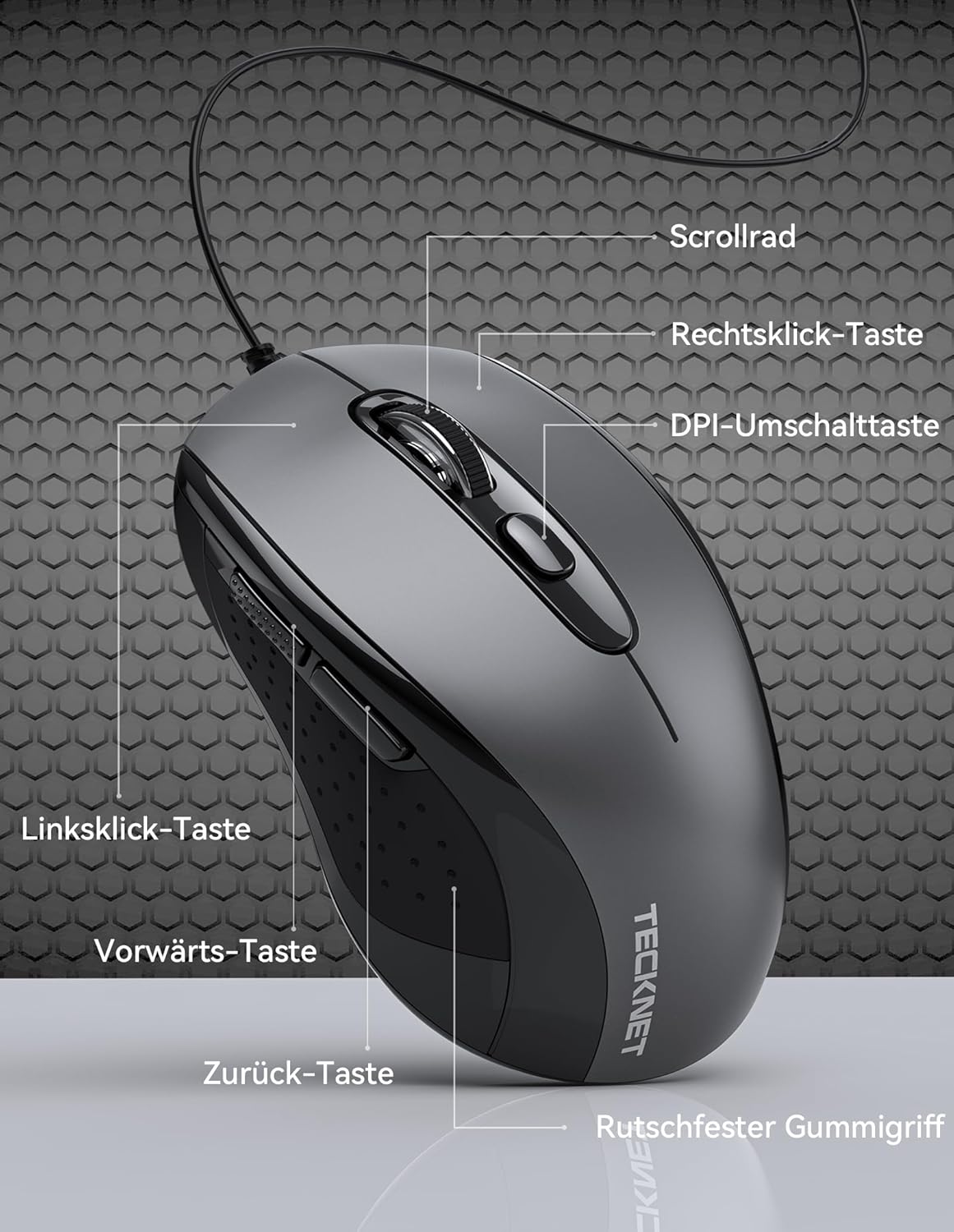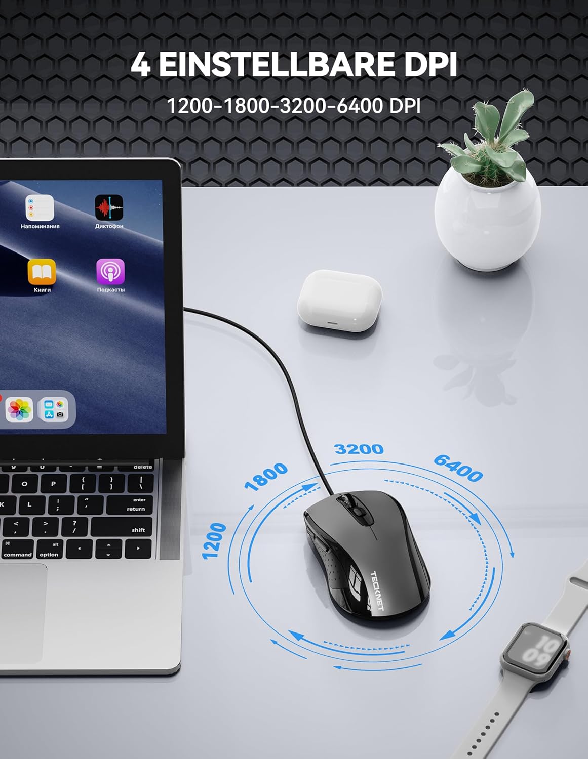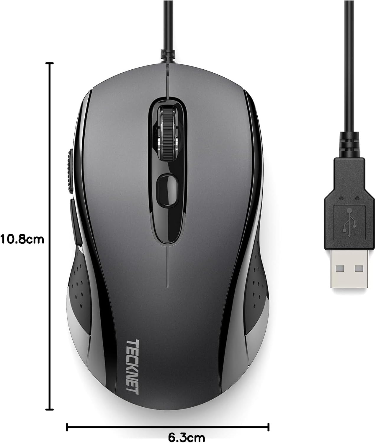 TECKNET Кабелна мишка, 6400DPI оптична бизнес мишка, ергономична кабелна мишка с 6 бутона, 4 регулируеми нива на DPI, USB Plug & Play, за лаптоп/PC/Mac - сива