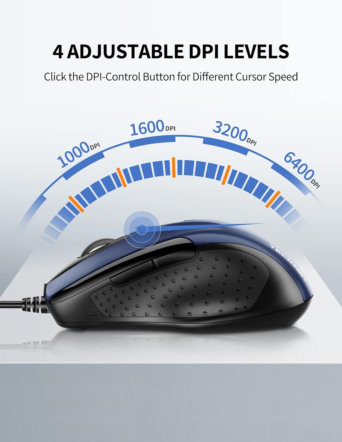TECKNET Кабелна оптична бизнес мишка Кабелна ергономична мишка с 6 бутона, 2 регулируеми нива на DPI, USB кабел 150 см