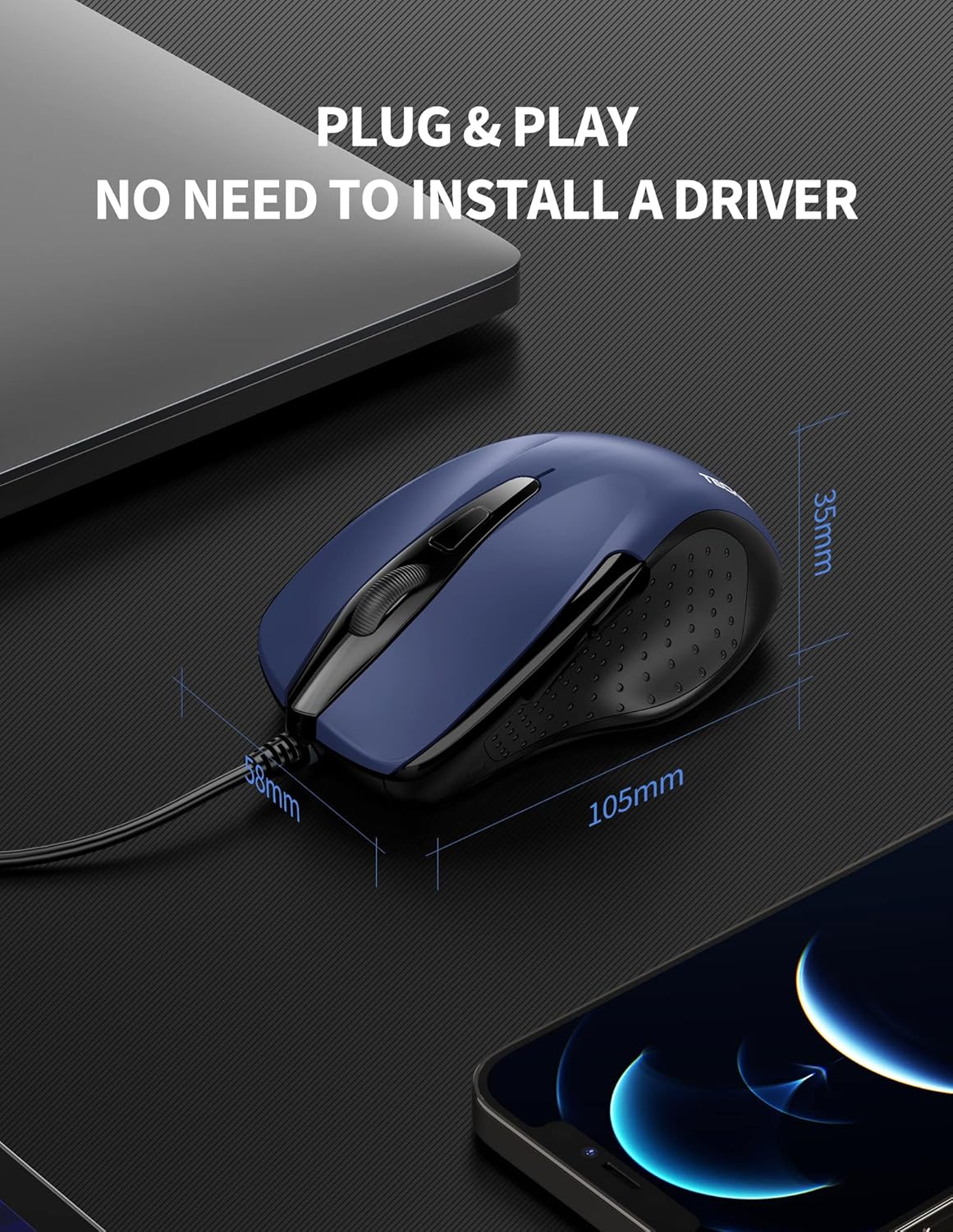 • ПЪЛНА СЪВМЕСТИМОСТ Кабелната мишка е съвместима с Windows 11, 10, 8.1, 8, 7, Vista, XP, Mac OS X и Chromebooks. (Страничните бутони не работят на Mac) Размерите на мишката са 10,5 x 5,8 x 3,5 см.