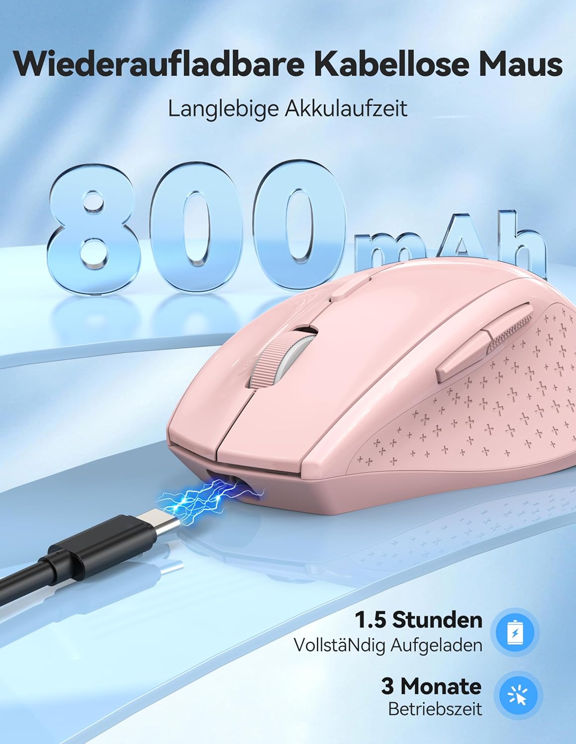 • 1,5 часа бързо зареждане, 3 месеца живот на батерията: Тази безжична компютърна мишка е оборудвана с високопроизводителна батерия от 800 mAh и технология за бързо зареждане и се зарежда напълно само за 1,5 часа. След едно зареждане може да се използва непрекъснато до 3 месеца, без да е необходимо да купувате допълнителни батерии - удобно и икономично, идеално за бизнес пътувания и работа в офис.
