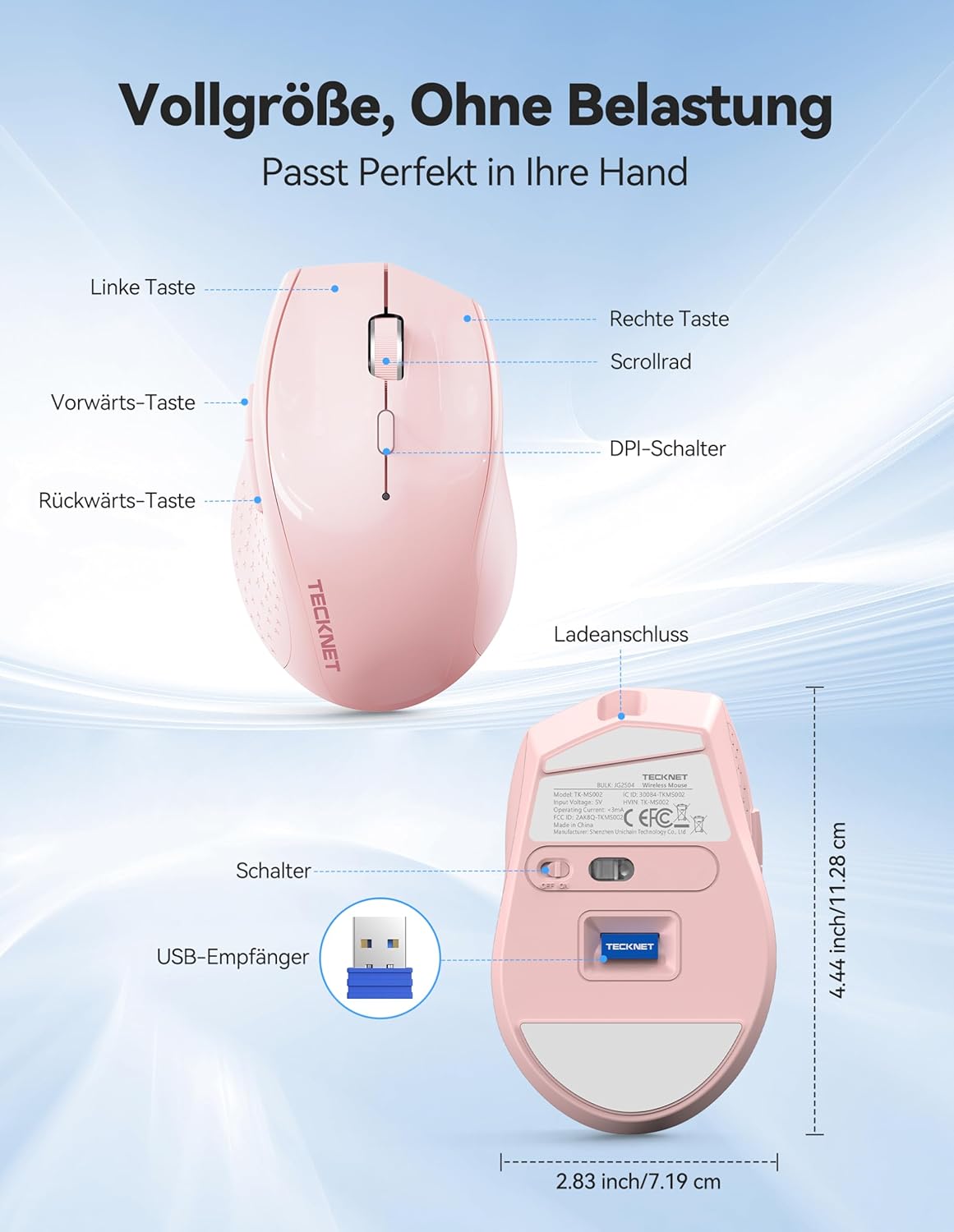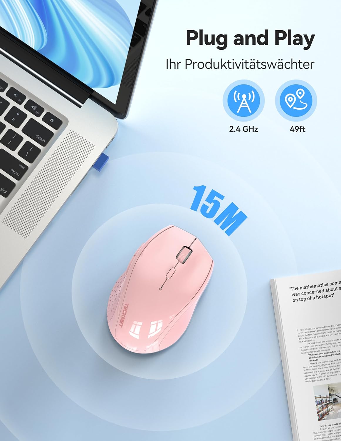 TECKNET PRO Безжична мишка, акумулаторна, безшумна безжична мишка, 6400 DPI, 2.4 GHz компютърна мишка, ергономични дръжки, 6 бутона, преносима мишка за компютър, лаптоп, Chromebook, Mac, розова