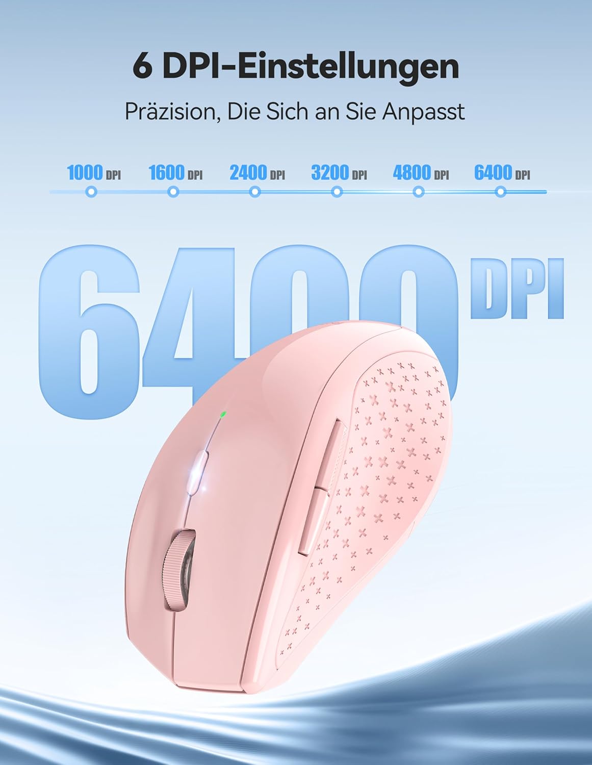 • До 6400 DPI, регулируема чувствителност на шест нива: Оборудвана с високопрецизен сензор, тази компютърна мишка безжично поддържа шест нива на DPI (6400/4800/3200/2400/1600/1000) - идеална за ежедневна употреба в офиса за интензивни игрови сесии. Максималната резолюция от 6400 DPI осигурява ултрабързи реакции и прецизен контрол по време на работа по дизайн и чертожене. С усъвършенствана технология за оптично проследяване и технология за адаптация към повърхността, курсорът работи без забавяне - независимо дали е върху подложка за мишка, бюро или стъклена повърхност.