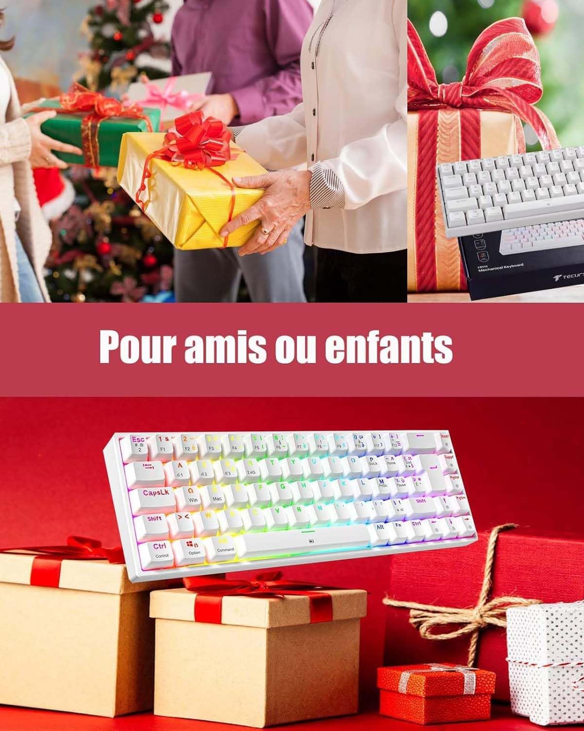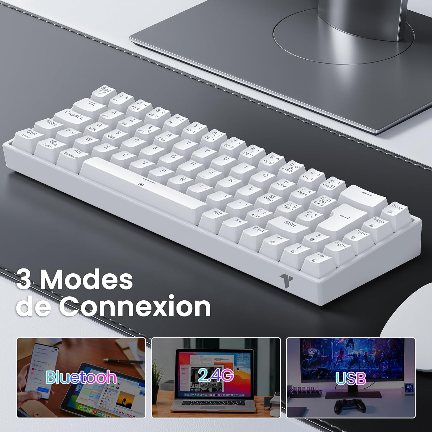 TECURS Механична геймърска клавиатура безжична, 80% TKL осветена безжична механична клавиатура с червени превключватели QWERTZ клавиатура за компютър, лаптоп, Windows (FR-бяла)