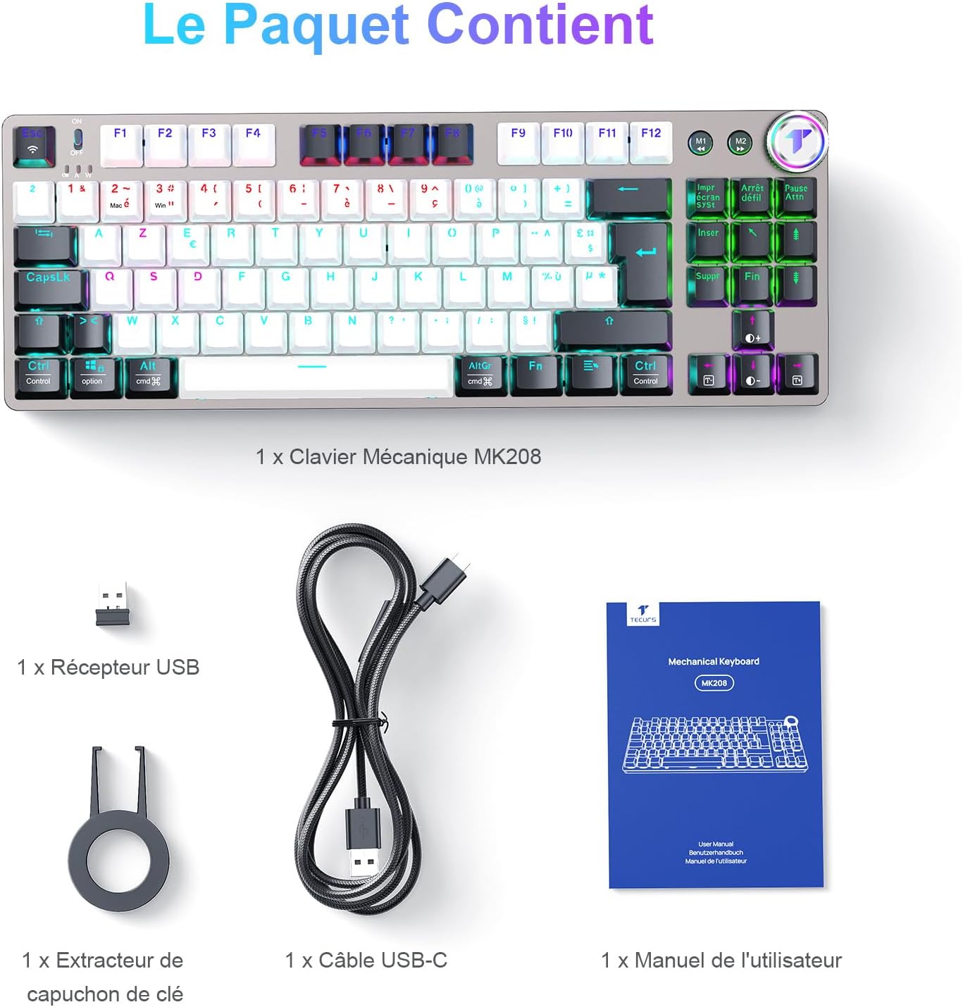 TECURS механична геймърска клавиатура безжична, 80% TKL осветена безжична механична клавиатура с червени превключватели QWERTZ клавиатура за компютър, лаптоп, Windows (FR-черно-бяла)