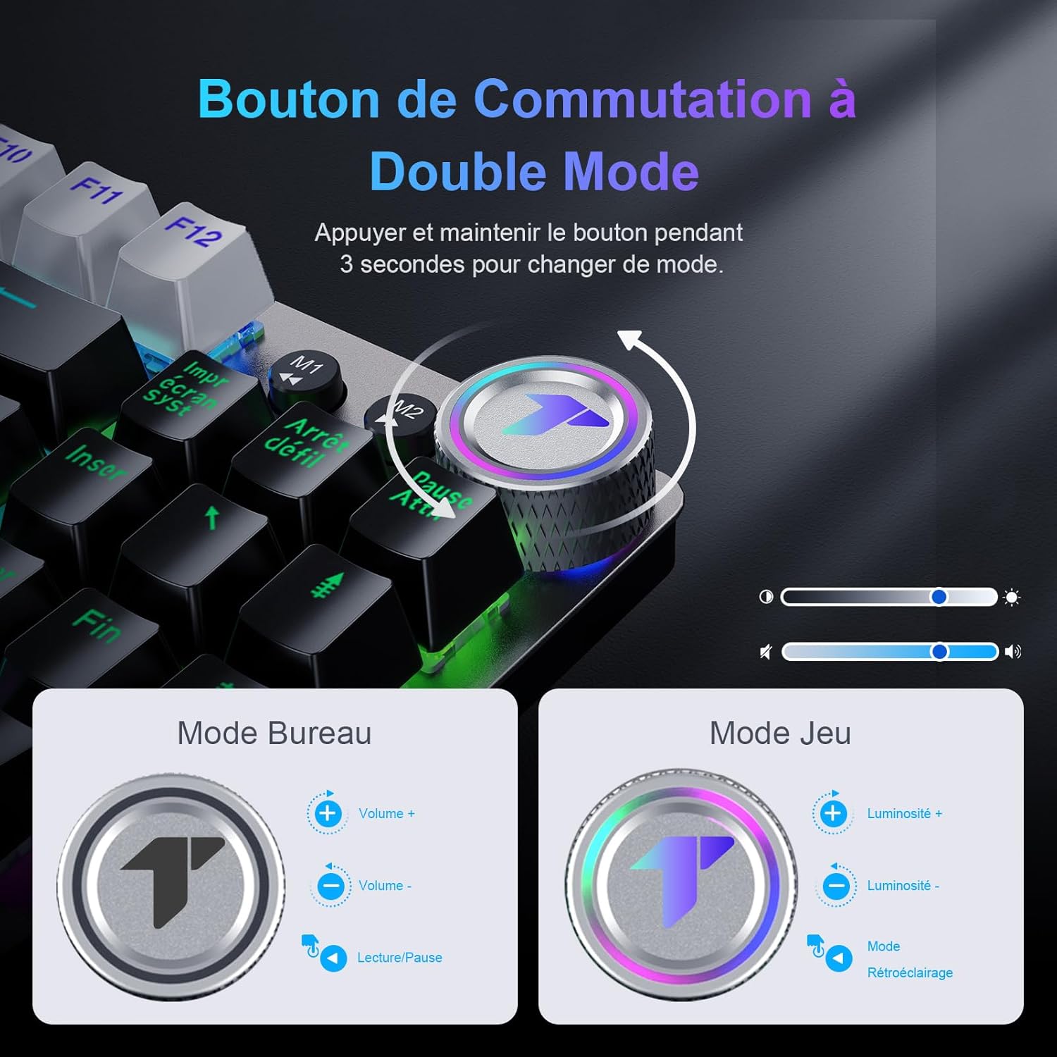• Въртящо се копче за двоен режим: механичната геймърска клавиатура е оборудвана с копче за двоен режим (офисен режим / геймърски режим) в горния десен ъгъл. Натиснете и задръжте този бутон за 3 секунди, за да промените режима. С въртящото се копче можете да регулирате осветлението или силата на звука.