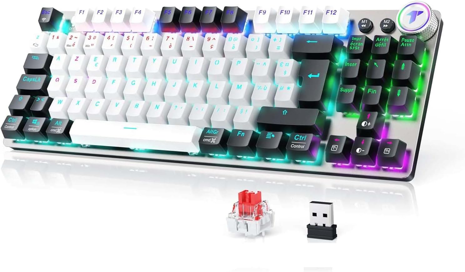 TECURS механична геймърска клавиатура безжична, 80% TKL осветена безжична механична клавиатура с червени превключватели QWERTZ клавиатура за компютър, лаптоп, Windows