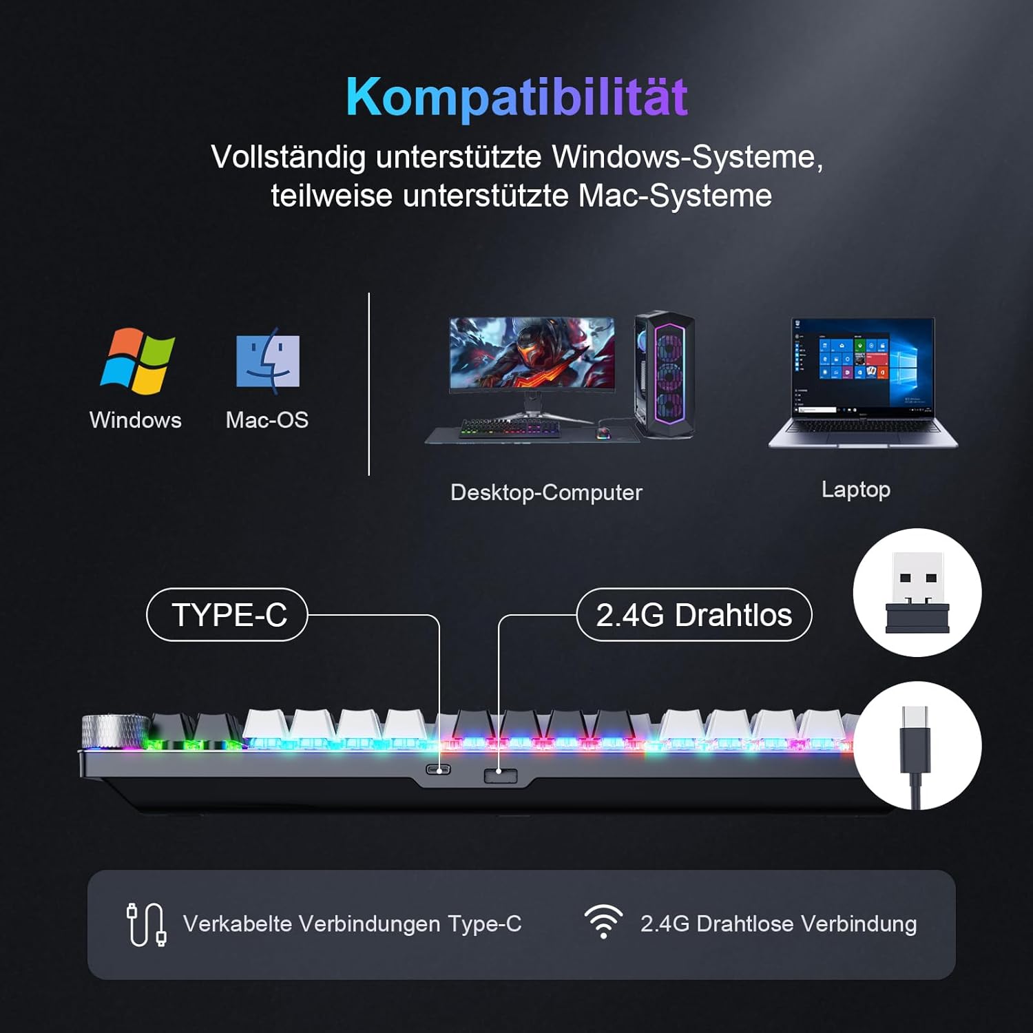 • СЪВМЕСТИМОСТ: Тази механична клавиатура има две опции за свързване, едната чрез безжична 2.4G връзка с адаптер и другата чрез подвижна кабелна USB връзка. Тази безжична геймърска клавиатура е съвместима с Windows. Подходяща за PC/PS4/PS5/Xbox/настолни компютри/лаптопи и много други устройства.