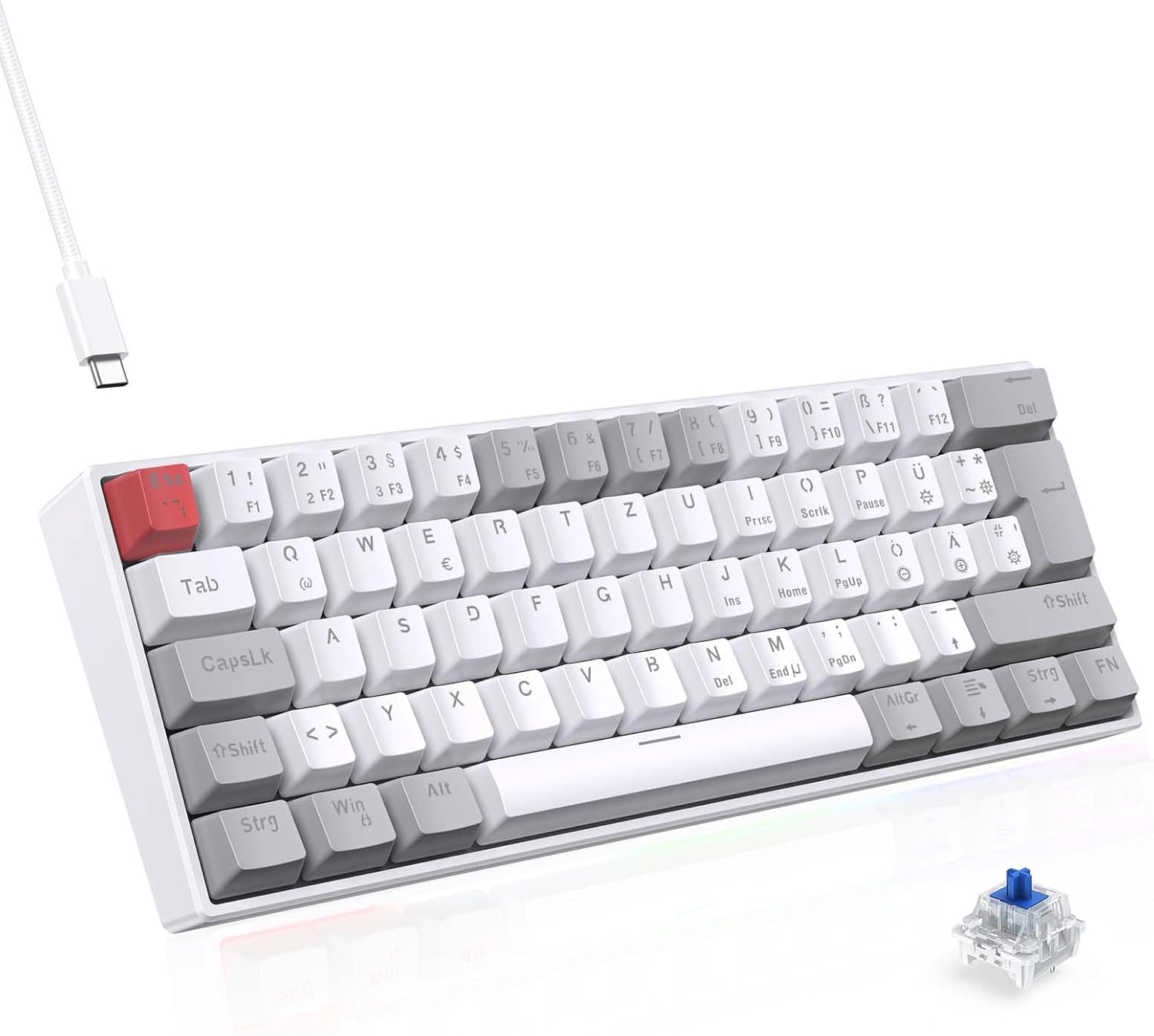 TECURS Механична геймърска клавиатура със сини превключватели (кабелна) - QWERTZ DE оформление, LED подсветка, компактна 60% клавиатура за PC/Windows/PS5/PS4 - бяла и сива