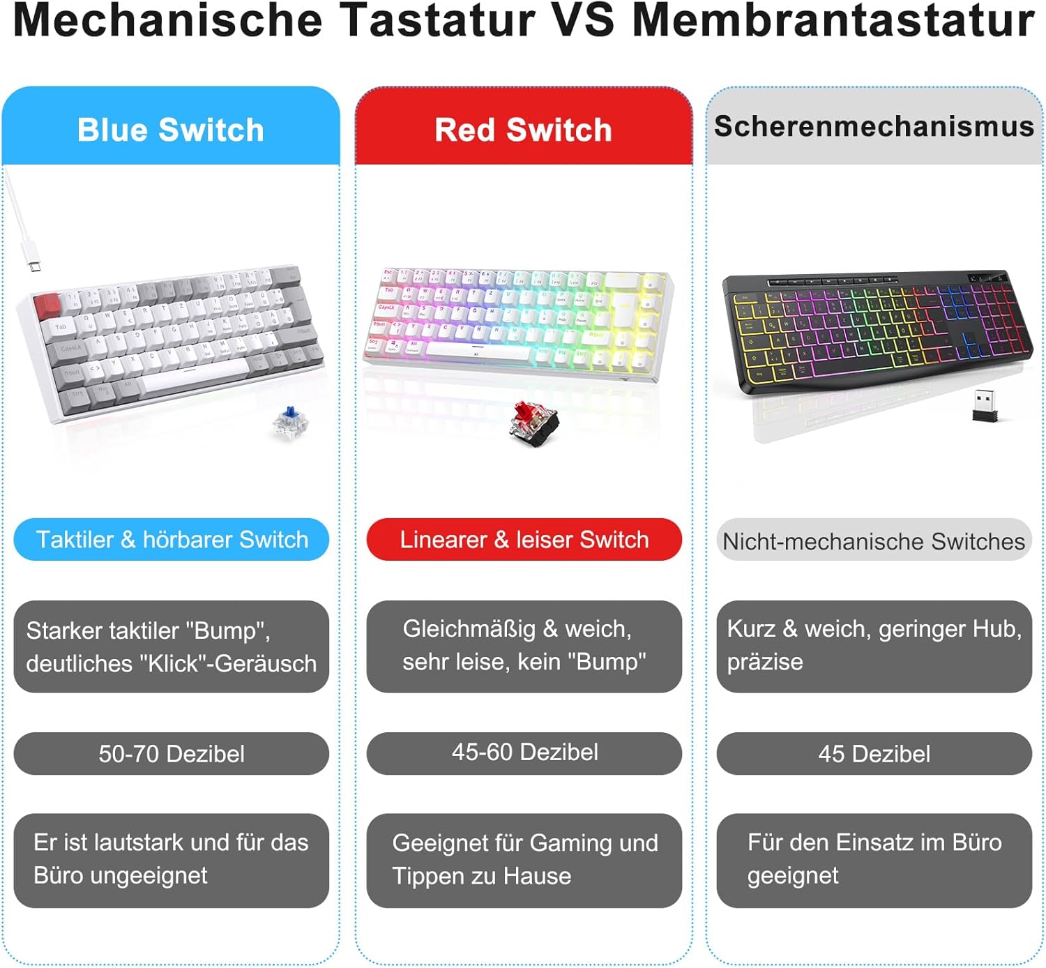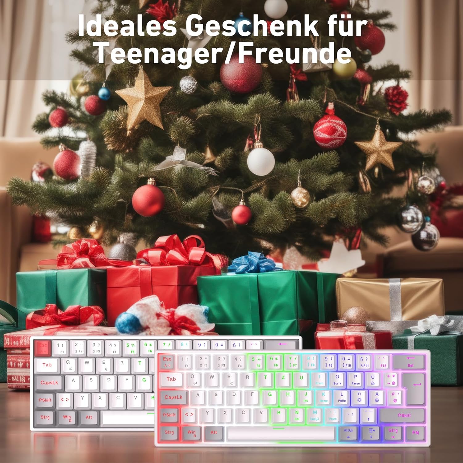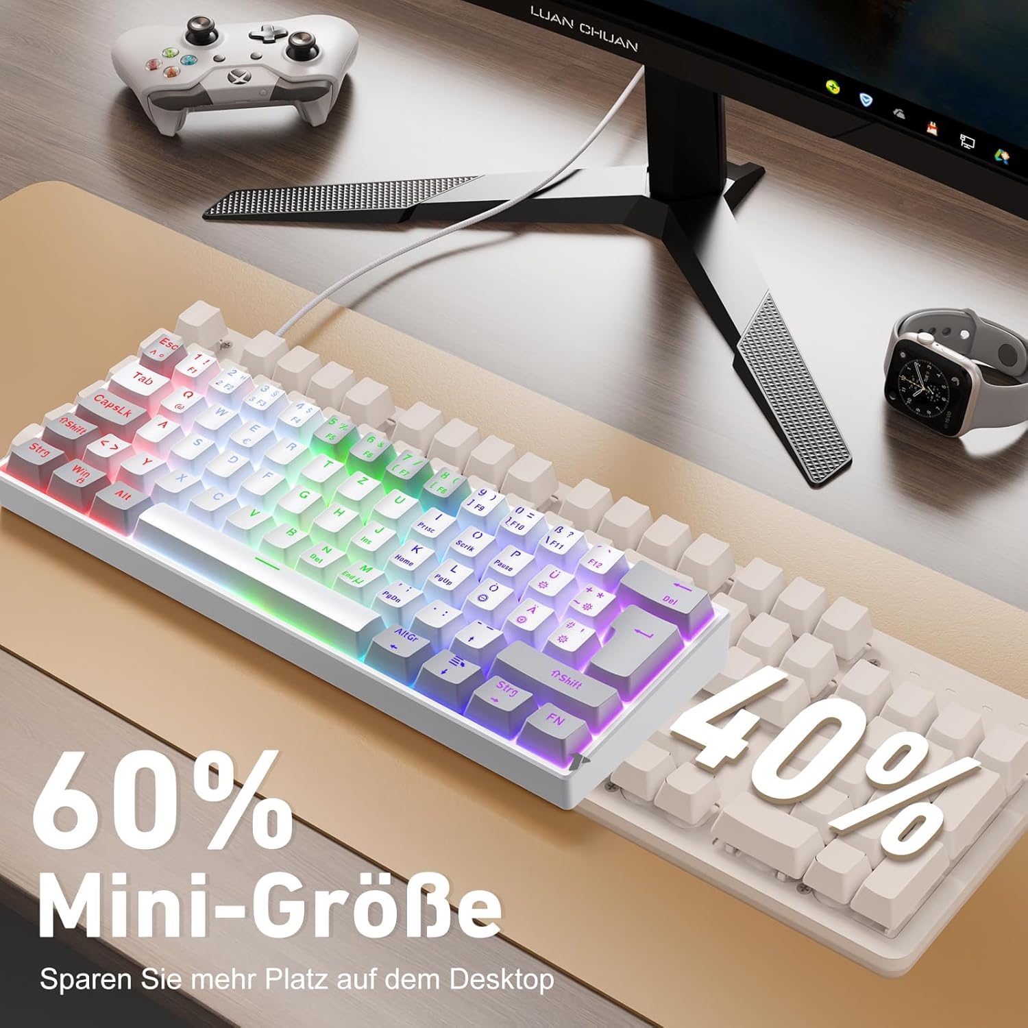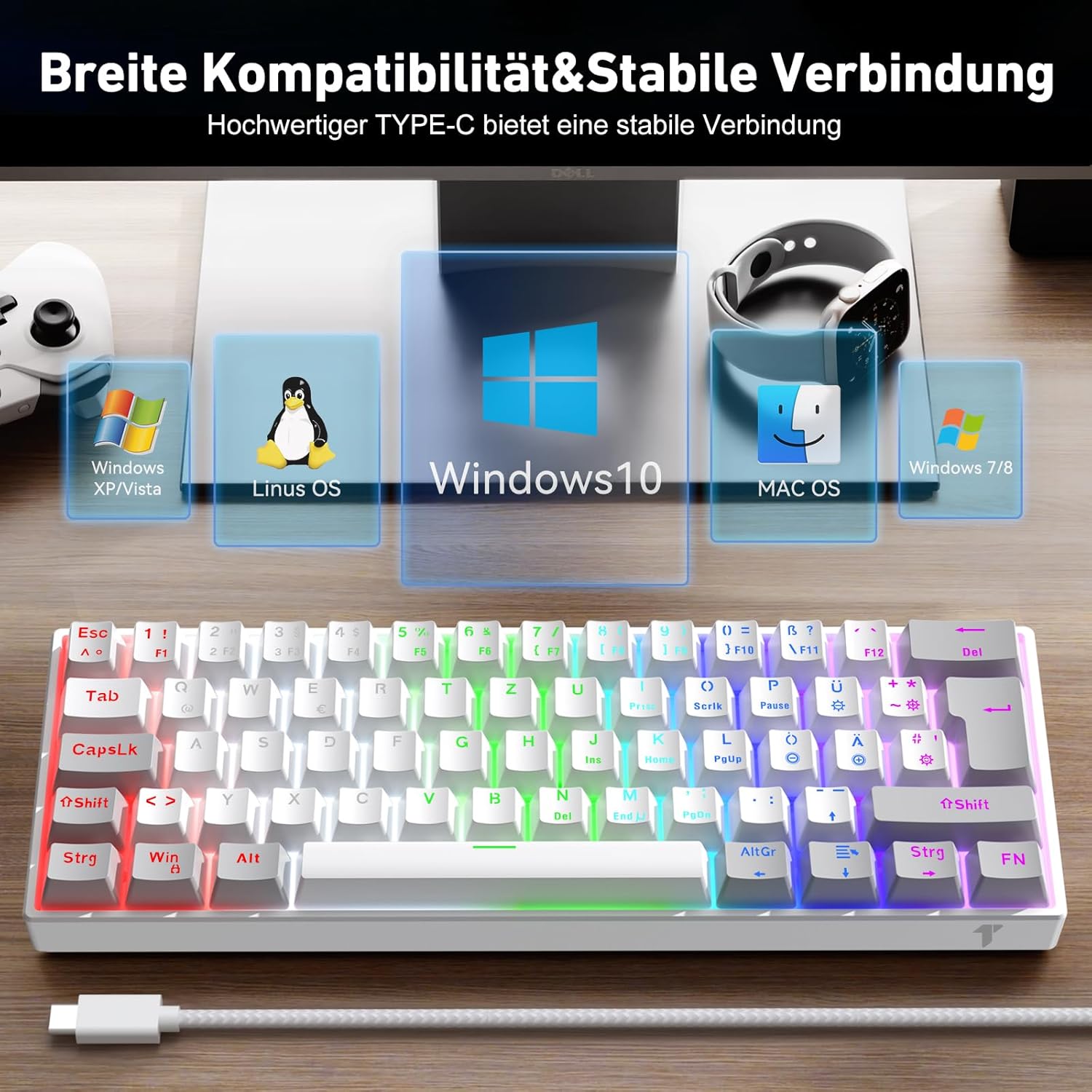 TECURS Механична геймърска клавиатура със сини превключватели (кабелна) - QWERTZ DE оформление, LED подсветка, компактна 60% клавиатура за PC/Windows/PS5/PS4 - бяла и сива