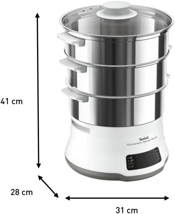 Tefal Convenient Series Deluxe Steamer, опростен сензорен екран, 8 програми, готвене на 3 нива, контейнер от неръждаема стомана, дълготрайно качество, здравословно приготвяне, неръждаема стомана/бял, VC502D