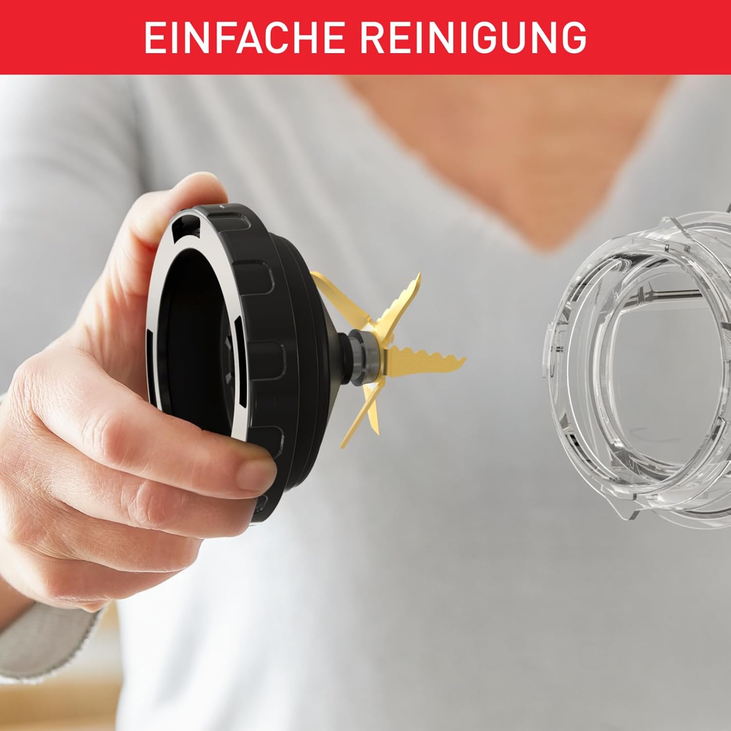 • Лесно почистване: програмата за автоматично почистване прави почистването изключително лесно - просто добавете вода и готово, съдът е чист! Остриетата са лесно свалящи се, а контейнерът от тритан е подходящ за съдомиялна машина за по-щателно почистване.