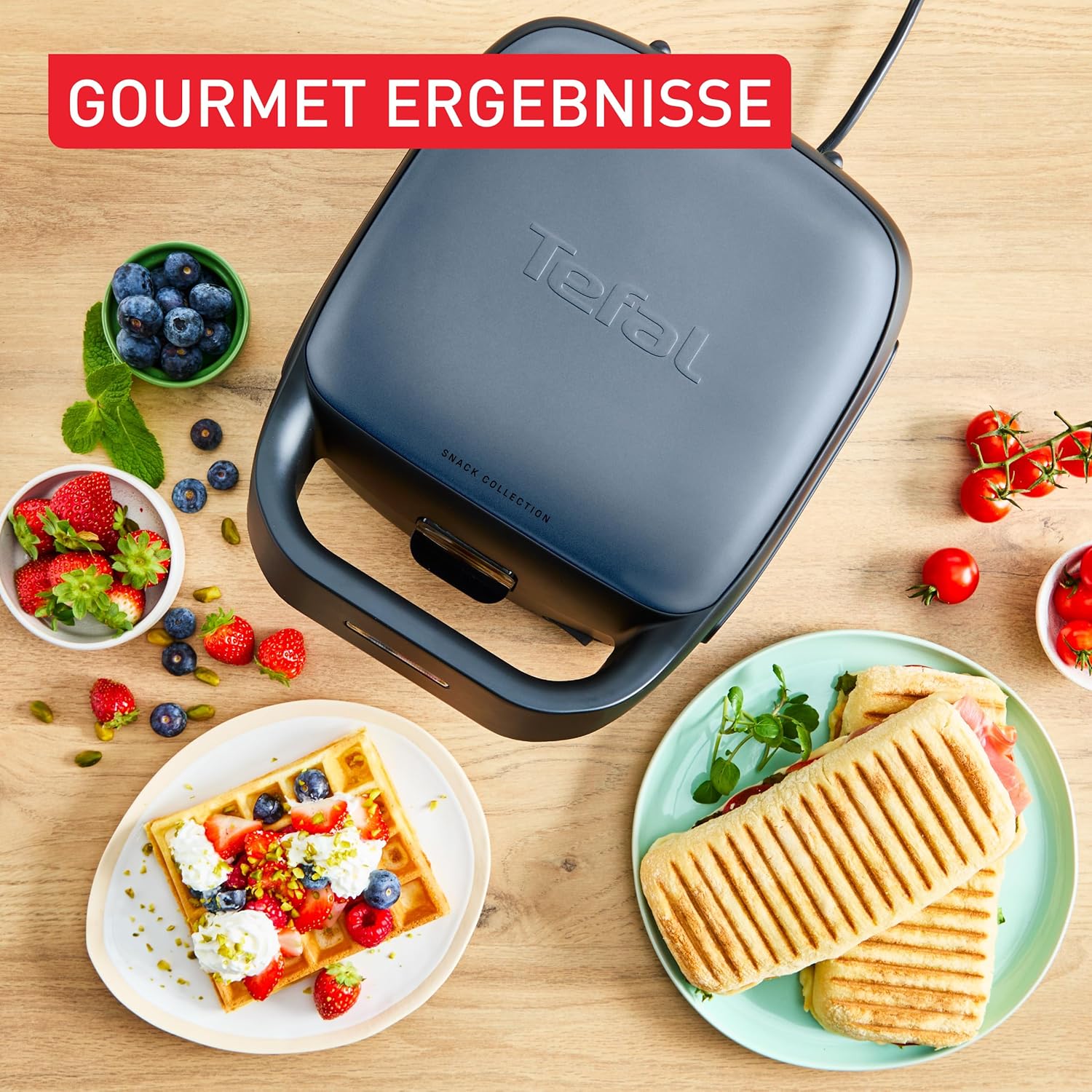 Tefal Snack Collection SW8674F0 700W Уред за сандвичи и гофрети, 2 комплекта подвижни чинии, незалепващо покритие, спестяващ място, включва книги с рецепти, черно/синьо
