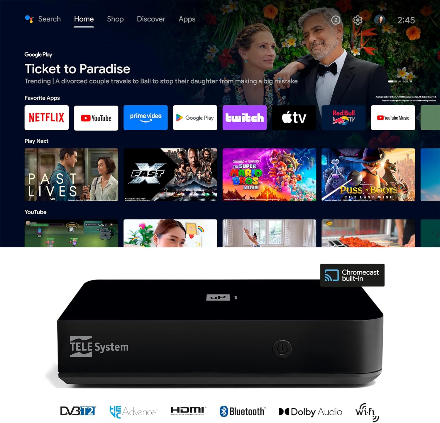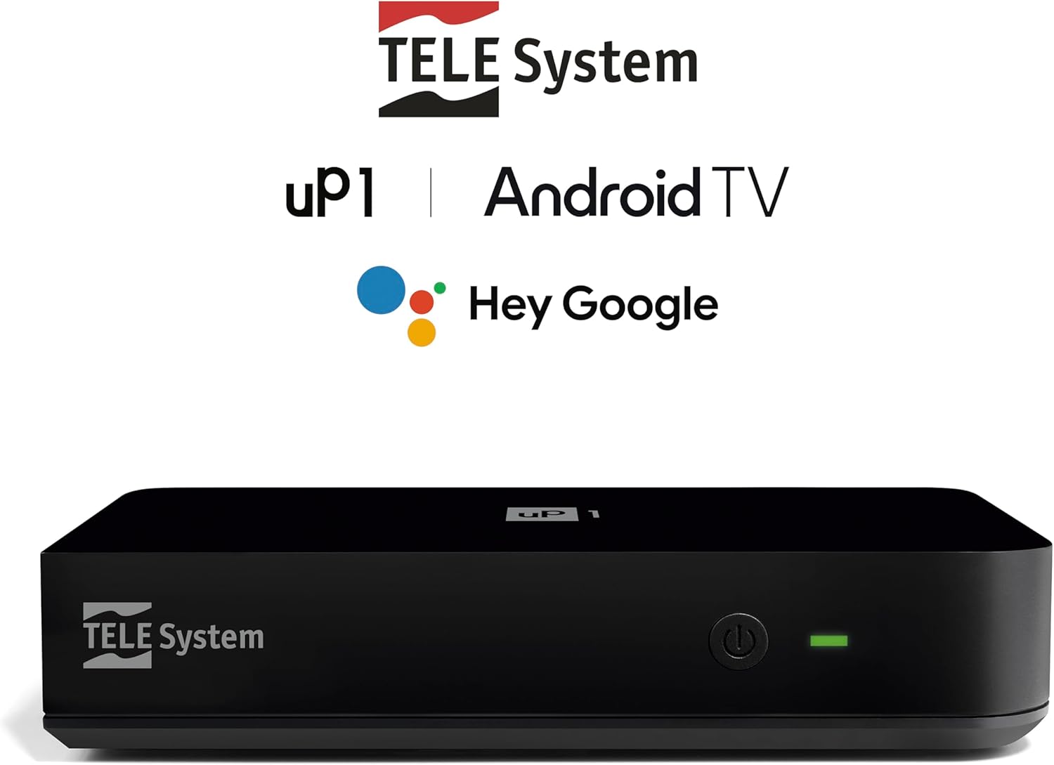 **TELE System UP1** е **цифров ефирен 2025**декодер с **Android TV Ultra HD**, който превръща всеки телевизор в **Smart TV** и го привежда в съответствие с най-новите стандарти за излъчване благодарение на **DVB-T2 HEVC HDR10 и HLG** тунера.