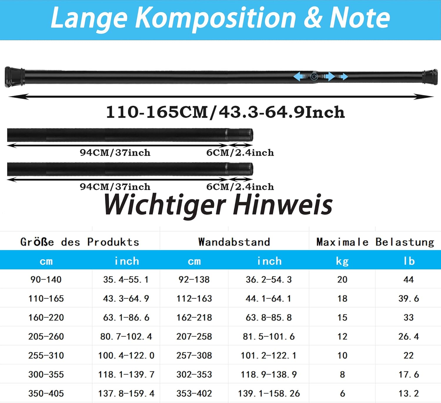 • Съдържание на опаковката и бележка: 1 x телескопичен прът 40-63 см, 2 x удължителен прът 35 см и 1 x допълнителен удължителен прът 25 см. Корниз за завеси без пробиване, моля, уверете се, че сте го монтирали в лявата фотогалерия след втората снимка и видеото за монтаж.
