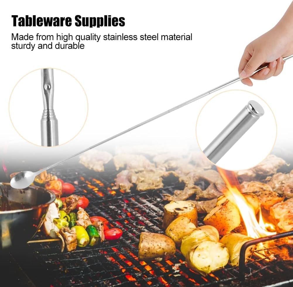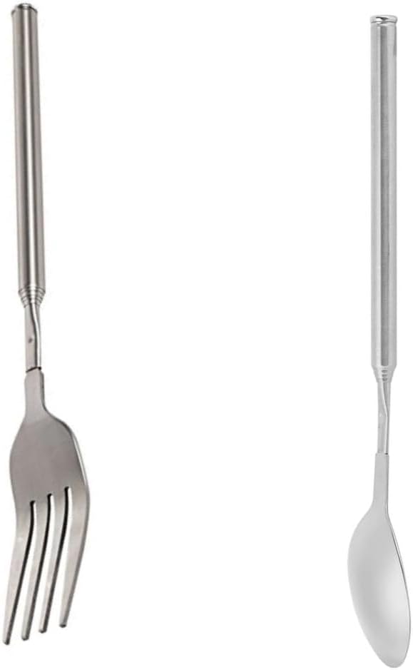 Телескопична вилица + телескопична лъжица, разтегателна вилица от неръждаема стомана с дължина 64 см, телескопична лъжица от неръждаема стомана с дължина 62 см за прибори за хранене, барбекю, вечеря