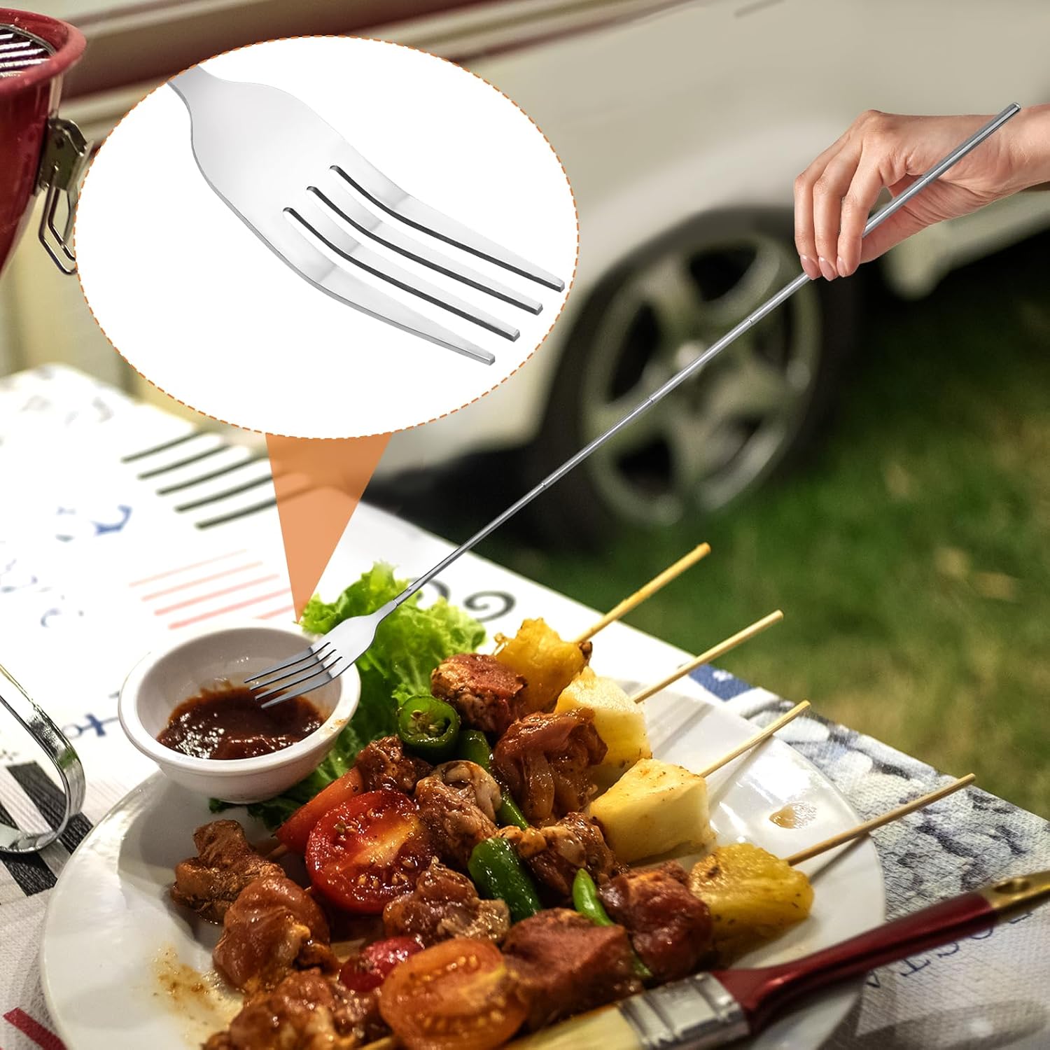 • Широка гама от приложения: Телескопичната вилица е идеален прибор за барбекюта, вечери, десерти, колбаси и зеленчуци. Прибиращата се вилица от неръждаема стомана ви позволява лесно да се наслаждавате на храната си на масата.