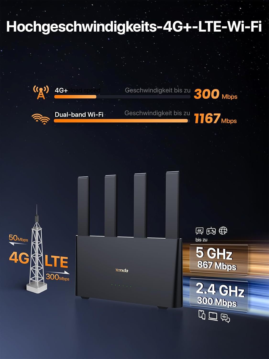 • [AC1200 Dual Band WiFi] WiFi скорости до 300Mbps на 2.4GHz и 867Mbps на 5GHz - този 4G рутер осигурява по-бързи връзки с всички ваши устройства, независимо дали за работа или забавление.