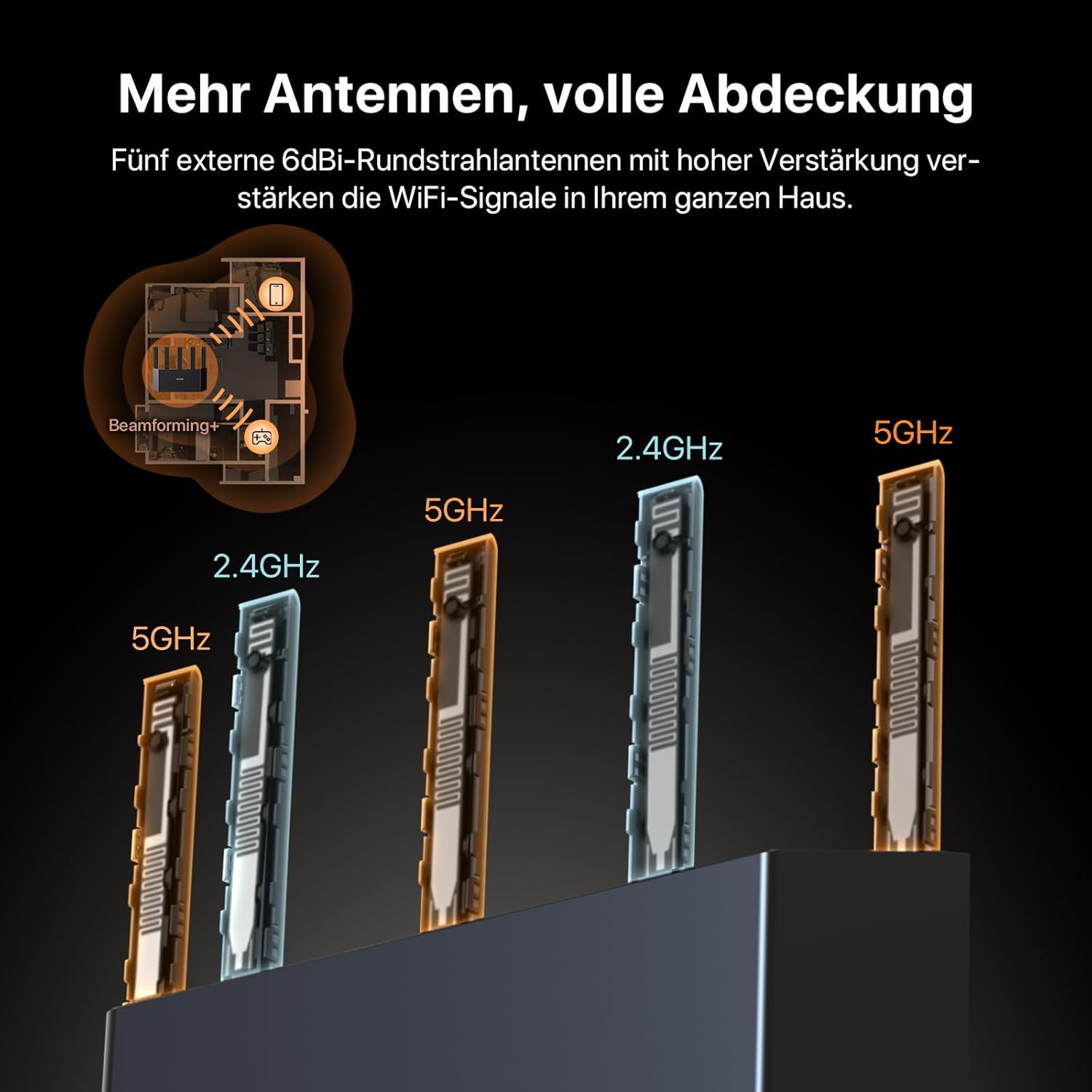 • 【Широко покритие】 5 x 6 dBi високопроизводителни антени с насочено предаване на сигнала Beamforming+ целят да подобрят сигнала във вашето местоположение, за да подобрят Wi-Fi покритието и качеството на сигнала по-ефективно, осигурявайки силен и неудържим сигнал, който прониква през стени.